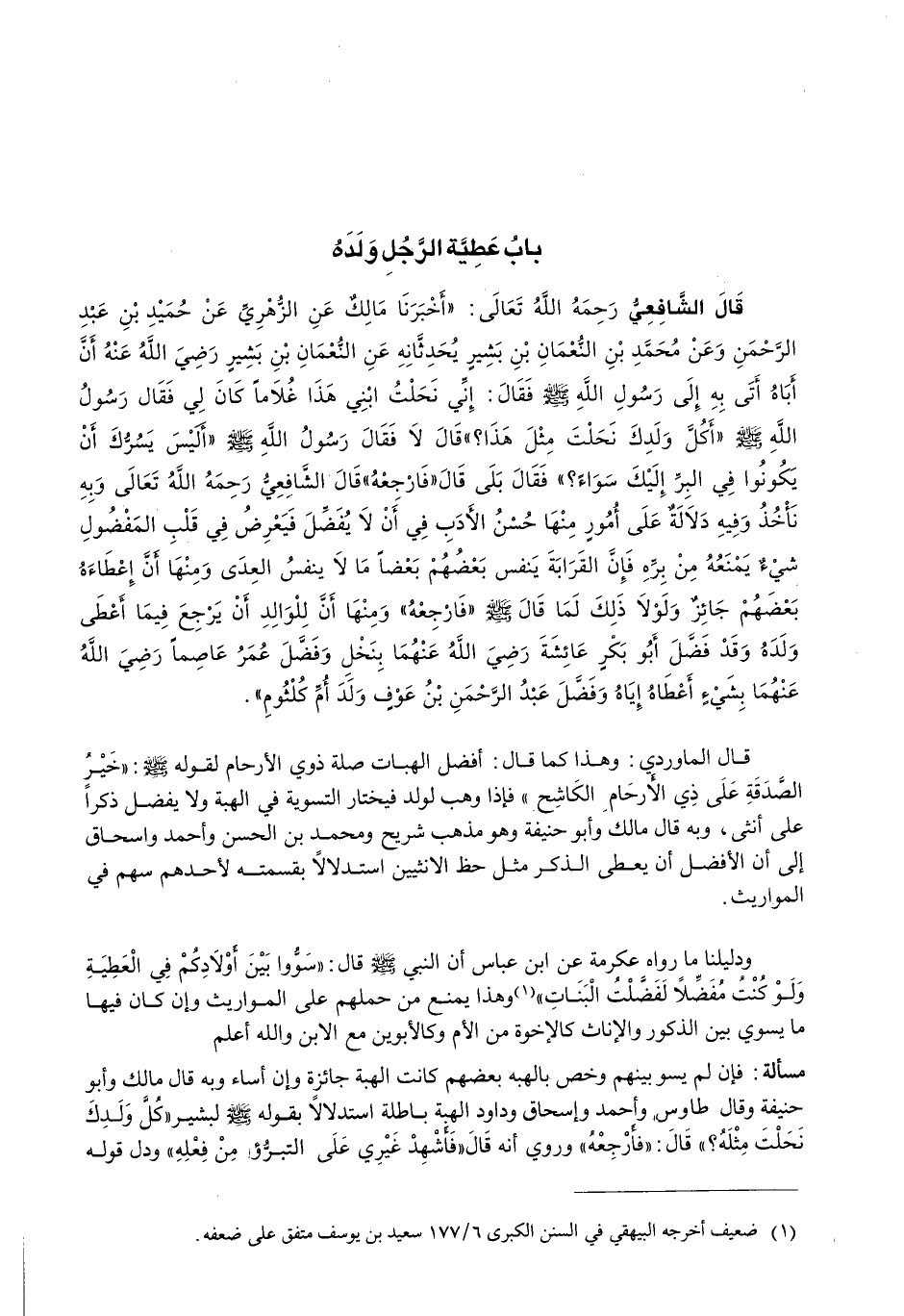 قال الشافعي رحمه الله تعالى: " أَخْبَرَنَا مالكٌ عَنِ الزُّهْرِيِّ عَنْ حُمَيْدِ بْنِ عَبْدِ الرَّحْمَنِ وَعَنْ مُحَمَدِ بْنِ النُّعْمَانِ بْنِ بَشِيرٍ يُحَدِّثَانِهِ عَنِ النُّعْمَانِ بْنِ بَشِيرٍ رَضِيَ اللَّهُ عَنْهُ أَنَّ أَبَاهُ أَتَى بِهِ إِلَى رَسُولِ اللَّهِ - صَلَّى اللَّهُ عَلَيْهِ وَسَلَّم َ - فَقَالَ: إِنِّي نَحَلْتُ ابْنِي هَذَا غُلَامًا كَانَ لِي فَقَالَ رَسُولُ اللَّهِ - صَلَّى اللَّهُ عَلَيْهِ وَسَلَّم َ - " أَكُلَّ وَلَدِكَ نَحَلْتَ مِثْلَ هَذَا؟ " قَالَ لَا فَقَالَ رَسُولُ اللَّهِ - صَلَّى اللَّهُ عَلَيْهِ وَسَلَّم َ - " أليس يَسُرُّكَ أَنْ يَكُونُوا فِي الْبِرِّ إِلَيْكَ سَوَاءً؟ " فقال بلى قال " فارجعه " قال الشافعي رحمه الله تعالى وَبِهِ نَأْخُذُ وَفِيهِ دلالةٌ عَلَى أمورٍ مِنْهَا حُسْنُ الْأَدَبِ فِي أَنْ لَا يُفَضِّلَ فَيَعْرِضُ فِي قَلْبِ الْمَفْضُولِ شيءٌ يَمْنَعُهُ مِنْ بِرِّهِ فَإِنَّ الْقَرَابَةَ يَنْفَسُ بَعْضُهُمْ بَعْضًا مَا لَا يَنْفَسُ الْعِدَى وَمِنْهَا أَنَّ إِعْطَاءَهُ بَعْضَهُمْ جائزٌ وَلَوْلَا ذَلِكَ لَمَا قَالَ - صَلَّى اللَّهُ عَلَيْهِ وَسَلَّم َ - " فَارْجِعْهُ " وَمِنْهَا أَنَّ لِلْوَالِدِ أَنْ يَرْجِعَ فِيمَا أَعْطَى وَلَدَهُ وَقَدْ فَضَّلَ أَبُو بَكْرٍ عَائِشَةَ رَضِيَ اللَّهُ عَنْهُمَا بِنَخْلٍ وَفَضَّلَ عُمَرُ عَاصِمًا رَضِيَ اللَّهُ عَنْهُمَا بِشَيْءٍ أَعْطَاهُ إِيَاهُ وَفَضَّلَ عبد الرحمن بن عوف ولد أم كلثوم ".