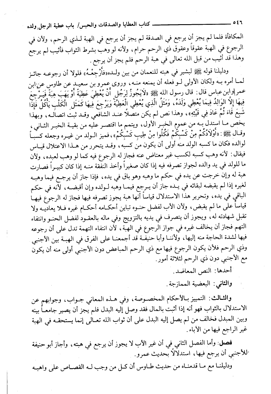 وَدَلِيلُنَا قوله - صَلَّى اللَّهُ عَلَيْهِ وَسَلَّم َ - لبشير في هبته للنعمان مِنْ بَيْنِ وَلَدِهِ " فَأَرْجِعْهُ " فَلَوْلَا أَنَّ رُجُوعَهُ جَائِزٌ لَمَا أَمَرَهُ بِهِ وَلَكَانَ الْأَوْلَى لَوْ فَعَلَهُ أَنْ يَمْنَعَهُ مِنْهُ، وَرَوَى عَمْرُو بْنُ سَعِيدٍ عَنْ طَاوُسٍ عَنِ ابْنِ عُمَرَ وَابْنِ عَبَّاسٍ قَالَ: قَالَ رَسُولُ اللَّهِ - صَلَّى اللَّهُ عَلَيْهِ وَسَلَّم َ - " لَا يَجُوزُ لرجلٍ أَنْ يُعْطِيَ عَطِيَةً أَوْ يَهَبَ هِبَةً فَيَرْجِعَ فِيهَا إِلَّا الْوَالِدُ فِيمَا يُعْطِي وَلَدَهُ، وَمَثَلُ الَّذِي يُعْطِي الْعَطِيَّةَ وَيَرْجِعُ فِيهَا كَمَثَلِ الْكَلْبِ يَأْكُلُ فَإِذَا شَبِعَ قَاءَ ثُمَ عَادَ فِي قَيْئِهِ "، وَهَذَا نَصٌّ لَمْ يَكُنْ مُتَّصِلًا عِنْدَ الشَّافِعِيِّ وَقَدْ ثَبَتَ اتِّصَالُهُ وَبِهَذَا يَخُصُّ مَا اسْتَدَلَّ بِهِ مِنْ عُمُومِ الْخَبَرِ الْأَوَّلِ، وَيُتَمِّمُ مَا اقْتَصَرَ عَلَيْهِ مِنْ بَقِيَّةِ الْخَبَرِ الثَّانِي، وَقَالَ - صَلَّى اللَّهُ عَلَيْهِ وَسَلَّم َ -: " أَوْلَادُكُمْ مِنْ كَسْبِكُمْ فَكُلُوا مِنْ طَيِّبِ كَسْبِكُمْ "، فَمَيَّزَ الْوَلَدَ مِنْ غَيْرِهِ وَجَعَلَهُ كَسْبًا لِوَالِدِهِ فَكَانَ مَا كَسَبَهُ الْوَلَدُ مِنْهُ أَوْلَى أَنْ يَكُونَ مِنْ كَسْبِهِ، وَقَدْ يَتَحَرَّرُ مِنْ هَذَا الِاعْتِلَالِ قِيَاسٌ فَيُقَالُ: لِأَنَّهُ وَهَبَ كَسْبَهُ لِكَسْبٍ غَيْرِ مُعْتَاضٍ عَنْهُ فَجَازَ لَهُ الرُّجُوعُ فِيهِ كَمَا لَوْ وَهَبَ لِعَبْدِهِ، وَلِأَنَّ مَا لِلْوَلَدِ فِي يَدِ وَالِدِهِ لِجَوَازِ تَصَرُّفِهِ فِيهِ إِذَا كَانَ صَغِيرًا وَأَخَذَ النَّفَقَةَ مِنْهُ إِذَا كَانَ كَبِيرًا فَصَارَتْ هِبَةً لَهُ وَإِنْ خَرَجَتْ عَنْ يَدِهِ فِي حُكْمِ مَا وَهَبَهُ وَهُوَ بَاقٍ فِي يَدِهِ، فَإِذَا جَازَ أَنْ يَرْجِعَ فِيمَا وَهَبَهُ لِغَيْرِهِ إِذَا لَمْ يَقْبِضْهُ لِبَقَائِهِ فِي يَدِهِ جَازَ أَنْ يَرْجِعَ فِيمَا وَهَبَهُ لِوَلَدِهِ وَإِنْ أَقْبَضَهُ، لِأَنَّهُ فِي حُكْمِ الْبَاقِي فِي يَدِهِ، وَتَحْرِيرُ هَذَا الِاسْتِدْلَالِ قِيَاسًا أَنَّهَا هِبَةٌ يَجُوزُ تَصَرُّفُهُ فِيهَا فَجَازَ لَهُ الرُّجُوعُ فِيهَا قِيَاسًا عَلَى مَا لَمْ يَقْبِضْ، وَلِأَنَّ الْأَبَ لِفَضْلِ حُنُوِّهِ تُبَايِنُ أَحْكَامُهُ أَحْكَامَ غَيْرِهِ فَلَا يُعَادِيهِ وَلَا تُقْبَلُ شَهَادَتُهُ لَهُ، وَيَجُوزُ أَنْ يَتَصَرَّفَ فِي يَدَيْهِ بِالتَّزْوِيجِ وَفِي مَالِهِ بِالْعُقُودِ لِفَضْلِ الْحُنُوِّ وَانْتِفَاءِ التُّهَمِ فَجَازَ أَنْ يُخَالِفَ غَيْرَهُ فِي جَوَازِ الرُّجُوعِ فِي الْهِبَةِ، لِأَنَّ انْتِفَاءَ التُّهْمَةِ تَدُلُّ عَلَى أَنَّ رُجُوعَهُ فِيهَا لِشِدَّةِ الْحَاجَةِ مِنْهُ إِلَيْهَا، وَلِأَنَّنَا وأبا حنيفة قَدْ أَجْمَعْنَا عَلَى الْفَرْقِ فِي الْهِبَةِ بَيْنَ الْأَجْنَبِيِّ وَذِي الرَّحِمِ فَلِأَنْ يَكُونَ الرُّجُوعُ فِيهَا مَعَ ذِي الرَّحِمِ الْمُبَاعِضِ دُونَ الْأَجْنَبِيِّ أَوْلَى مِنْهُ أَنْ يَكُونَ مَعَ الْأَجْنَبِيِّ دُونَ ذِي الرَّحِمِ لِثَلَاثَةِ أُمُورٍ.