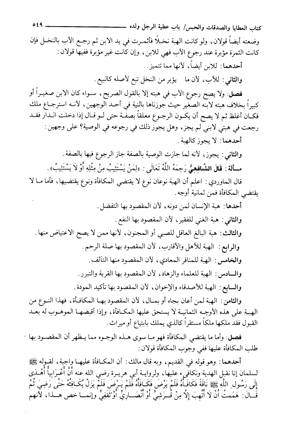 قَالَ الْمَاوَرْدِيُّ: اعْلَمْ أَنَّ الْهِبَةَ نَوْعَانِ نَوْعٌ لَا يَقْتَضِي الْمُكَافَأَةَ وَنَوْعٌ يَقْتَضِيهَا، فَأَمَّا مَا لَا يَقْتَضِي الْمُكَافَأَةَ فَمِنْ ثَمَانِيَةِ أَوْجُهٍ.