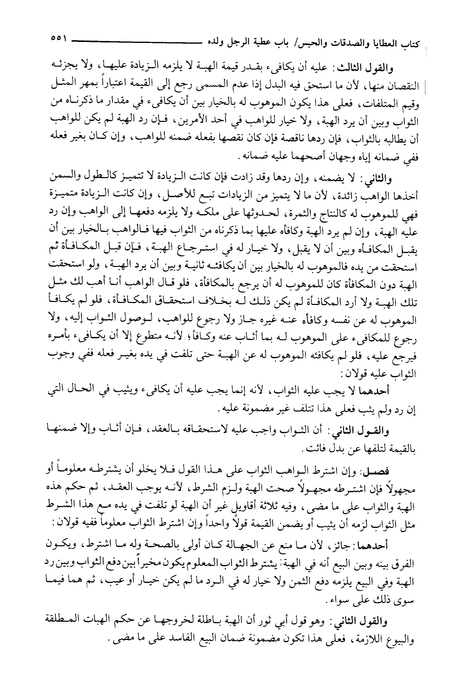 وَالْقَوْلُ الثَّالِثُ: عَلَيْهِ أَنْ يُكَافِئَ بِقَدْرِ قِيمَةِ الْهِبَةِ لَا يَلْزَمُهُ الزِّيَادَةُ عَلَيْهَا، وَلَا يُجْزِئُهُ النُّقْصَانُ مِنْهَا، لِأَنَّ مَا اسْتَحَقَّ فِيهِ الْبَدَلُ إِذَا عُدِمَ الْمُسَمَّى رَجَعَ إِلَى الْقِيمَةِ اعْتِبَارًا بِمَهْرِ الْمِثْلِ وَقِيَمِ الْمُتْلَفَاتِ، فَعَلَى هَذَا يَكُونُ الْمَوْهُوبُ لَهُ بِالْخِيَارِ بَيْنَ أَنْ يُكَافِئَ فِي مِقْدَارِ مَا ذَكَرْنَاهُ مِنَ الثَّوَابِ وَبَيْنَ أَنْ يَرُدَّ الْهِبَةَ، وَلَا خِيَارَ لِلْوَاهِبِ فِي أَحَدِ الْأَمْرَيْنِ، فَإِنْ رَدَّ الْهِبَةَ لَمْ يَكُنْ لِلْوَاهِبِ أَنْ يُطَالِبَهُ بِالثَّوَابِ، فَإِنْ رَدَّهَا نَاقِصَةً فَإِنْ كَانَ نَقْصُهَا بِفِعْلِهِ ضَمِنَهُ لِلْوَاهِبِ، وَإِنْ كَانَ بِغَيْرِ فِعْلِهِ فَفِي ضَمَانِهِ إِيَّاهُ وَجْهَانِ أَصَحُّهُمَا عَلَيْهِ ضَمَانُهُ.