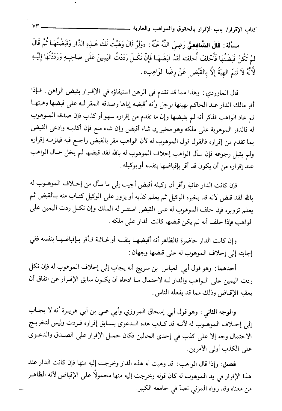 أَحَدُهُمَا: وَهُوَ قَوْلُ أَبِي الْعَبَّاسِ بْنِ سُرَيْجٍ أَنَّهُ يُجَابُ إِلَى إِحْلَافِ الْمَوْهُوبِ لَهُ فَإِنْ نَكَلَ رُدَّتِ الْيَمِينُ عَلَى الْوَاهِبِ وَالدَّارُ لَهُ لِاحْتِمَالِ مَا ادَّعَاهُ أَنْ يَكُونَ سَابِقَ الْإِقْرَارِ عَنِ اتِّفَاقٍ أَنْ يُعْقِبَهُ الْإِقْبَاضَ وَذَلِكَ مِمَّا قَدْ يَفْعَلُهُ النَّاسُ.