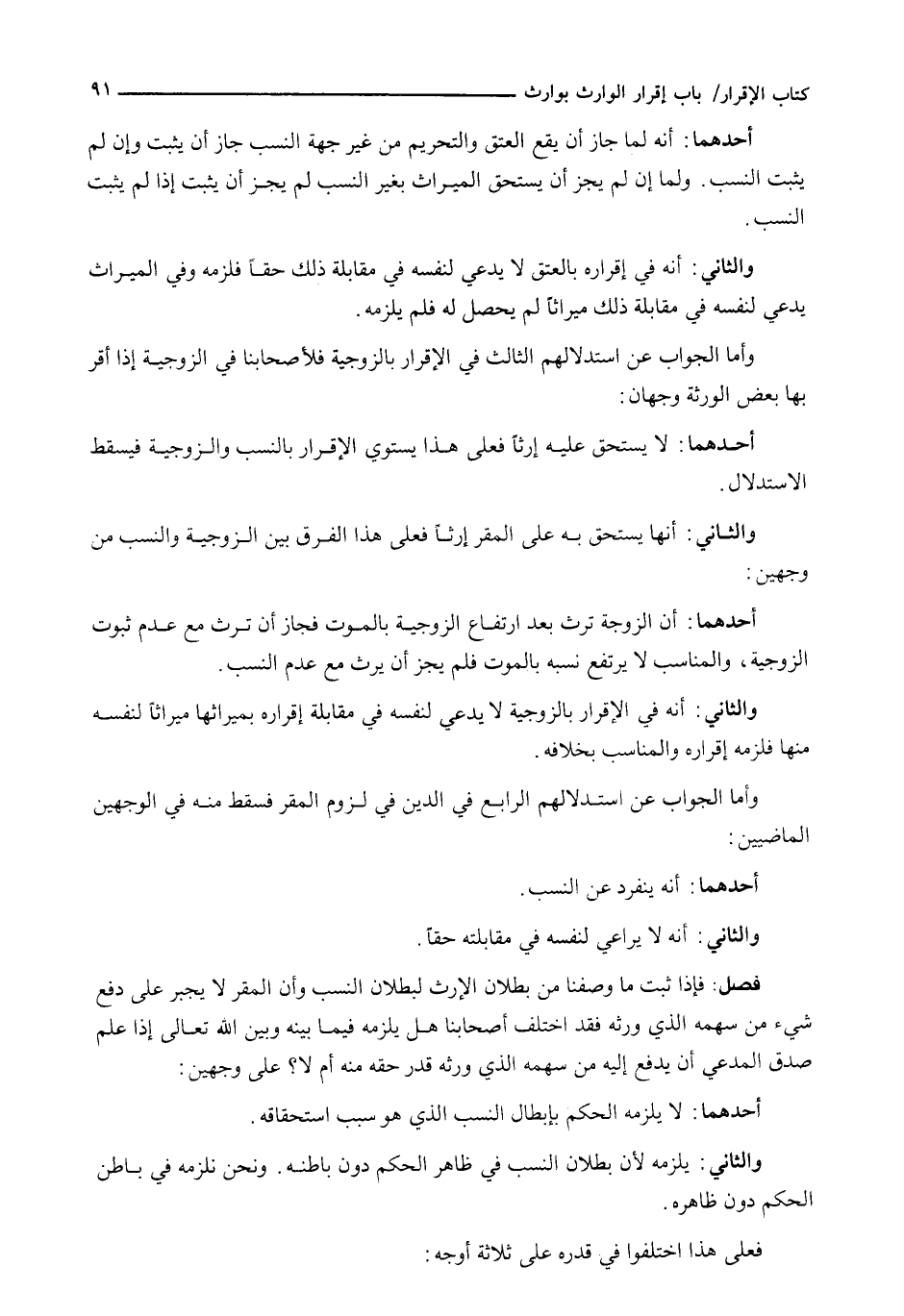 وَأَمَّا الْجَوَابُ عَنِ اسْتِدْلَالِهِمِ الثَّالِثِ فِي الْإِقْرَارِ بِالزَّوْجِيَّةِ فَلِأَصْحَابِنَا فِي الزَّوْجِيَّةِ إِذَا أَقَرَّ بِهَا بَعْضُ الْوَرَثَةِ وَجْهَانِ: