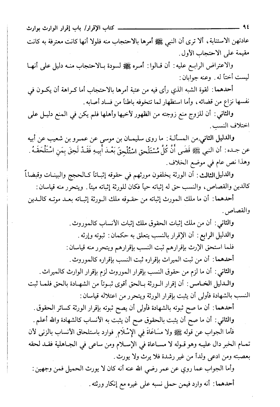 وَالدَّلِيلُ الرَّابِعُ: أَنَّ الْإِقْرَارَ بِالنَّسَبِ يَتَعَلَّقُ بِهِ حُكْمَانِ: ثُبُوتُهُ وَإِرْثُهُ.