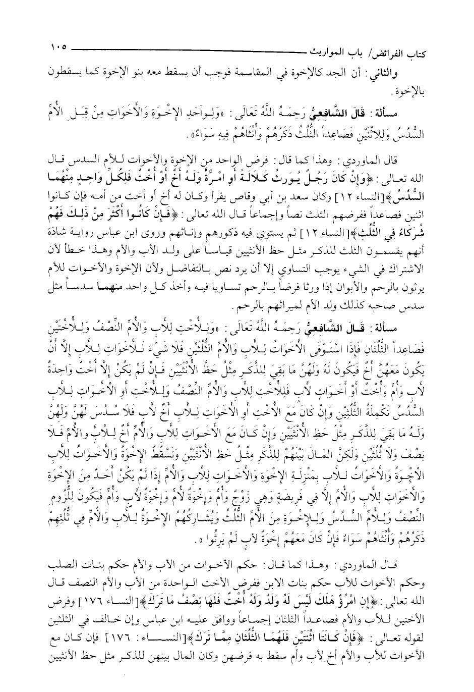 قال المارودي: وَهَذَا كَمَا قَالَ: فَرْضُ الْوَاحِدِ مِنَ الْإِخْوَةِ وَالْأَخَوَاتِ لِلْأُمِّ السُّدُسُ قَالَ اللَّهُ تَعَالَى: {وَإِنْ كَانَ رَجُلٌ يُورَثُ كَلالَةً أَوِ امْرَأَةٌ وَلَهُ أَخٌ أَوْ أُخْتٌ فَلِكُلِّ وَاحِدٍ مِنْهُمَا السُّدُسُ} [النساء: 12] وَكَانَ سَعْدُ بْنُ أَبِي وَقَّاصٍ يَقْرَأُ وَكَانَ لَهُ أَخٌ أَوْ أُخْتٌ مِنْ أُمِّهِ فَإِنْ كَانُوا اثْنَيْنِ فَصَاعِدًا فَفَرْضُهُمُ الثُّلُثُ نَصًّا وَإِجْمَاعًا قَالَ اللَّهُ تَعَالَى: {فَإِنْ كَانُوا أَكْثَرَ مِنْ ذَلِكَ فَهُمْ شُرَكَاءُ فِي الثُّلُثِ} [النساء: 12] ثم يستوي فيه ذكورهم وإناثهم وروى ابن عباس رواية شاذة أنهم يقسمون الثُّلُثَ لِلذَّكَرِ مِثْلُ حَظِّ الْأُنْثَيَيْنِ قِيَاسًا عَلَى وَلَدِ الْأَبِ وَالْأُمِّ وَهَذَا خَطَأٌ لِأَنَّ الِاشْتِرَاكَ في الشيء يوجب التَّسَاوِي إِلَّا أَنْ يَرِدَ نَصٌّ بِالتَّفَاضُلِ وَلِأَنَّ الْإِخْوَةَ وَالْأَخَوَاتِ لِلْأُمِّ يَرِثُونَ بِالرَّحِمِ وَالْأَبَوَانِ إِذَا وَرِثَا فَرْضًا بِالرَّحِمِ تَسَاوَيَا فِيهِ وَأَخَذَ كُلُّ وَاحِدٍ مِنْهُمَا سُدُسًا مِثْلَ سُدُسِ صَاحِبِهِ كَذَلِكَ ولد الأم لميراثهم بالرحم.