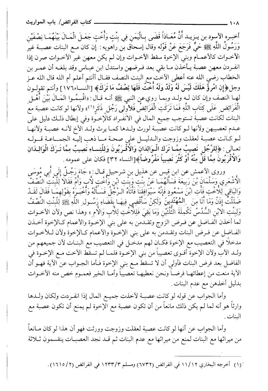 وروى الأعمش عن ابن قيس عن هذيل بْنِ شُرَحْبِيلَ قَالَ: " جَاءَ رَجُلٌ إِلَى أَبِي مُوسَى الْأَشْعَرِيِّ وَسَلْمَانَ بْنِ رَبِيعَةَ فَسَأَلَهُمَا عَنْ بنت وبنت ابن وأخت لأب وأم فقالا للبنت النصف والباقي للأخت فأت ابْنَ مَسْعُودٍ فَإِنَّهُ سَيُوَافِقُنَا فَأَتَاهُ الرَّجُلُ فَسَأَلَهُ وَأَخْبَرَه بِقَوْلِهِمَا فَقَالَ لَقَدْ ضَلَلْتُ إِذَنْ وَمَا أنا من المهتدين ولكن سَأَقْضِي فِيهَا بِقَضَاءِ رَسُولِ اللَّهِ - صَلَّى اللَّهُ عَلَيْهِ وَسَلَّم َ - للبنت النصف ولبنت الابن السدس تكملة الثلثين وَمَا بَقِيَ فَلِلْأُخْتِ لِلْأَبِ وَالْأُمِّ " وَهَذَا نَصٌّ وَلِأَنَّ الْأَخَوَاتِ لَمَّا أَخَذْنَ الْفَاضِلَ عَنْ فَرْضِ الزَّوْجِ وَتَقَدَّمْنَ بِهِ عَلَى بَنِي الْإِخْوَةِ وَالْأَعْمَامِ كَالْإِخْوَةِ أَخَذْنَ الْفَاضِلَ عَنْ فَرْضِ الْبَنَاتِ وَتَقَدَّمْنَ بِهِ عَلَى بَنِي الْإِخْوَةِ وَالْأَعْمَامِ كَالْإِخْوَةِ وَلِأَنَّ لِلْأَخَوَاتِ مُدْخَلًا فِي التَّعْصِيبِ مَعَ الْإِخْوَةِ فَكَانَ لَهُمْ مُدْخَلٌ فِي التَّعْصِيبِ مَعَ الْبَنَاتِ لِأَنَّ جَمِيعَهُمْ مِنْ وَلَدِ الْأَبِ وَلِأَنَّ الْإِخْوَةَ أَقْوَى تَعْصِيبًا مِنْ بَنِي الْإِخْوَةِ فَلَمَّا لَمْ تَسْقُطِ الْأُخْتُ مَعَ الْإِخْوَةِ فِي الْفَاضِلِ بَعْدَ فَرْضِ البنات فأولى أن لا يسقط مَعَ بَنِي الْإِخْوَةِ فَأَمَّا الْجَوَابُ عَنِ الْآيَةِ فَهُوَ أَنَّ الْآيَةَ مَنَعَتْ مِنْ إِعْطَائِهَا فَرْضًا ونحن نعطيها تعصيبا وأما الخير فعموم خص مِنْهُ الْأَخَوَاتِ بِدَلِيلِ أَخْذِهِنَّ مَعَ عَدَمِ الْبَنَاتِ.