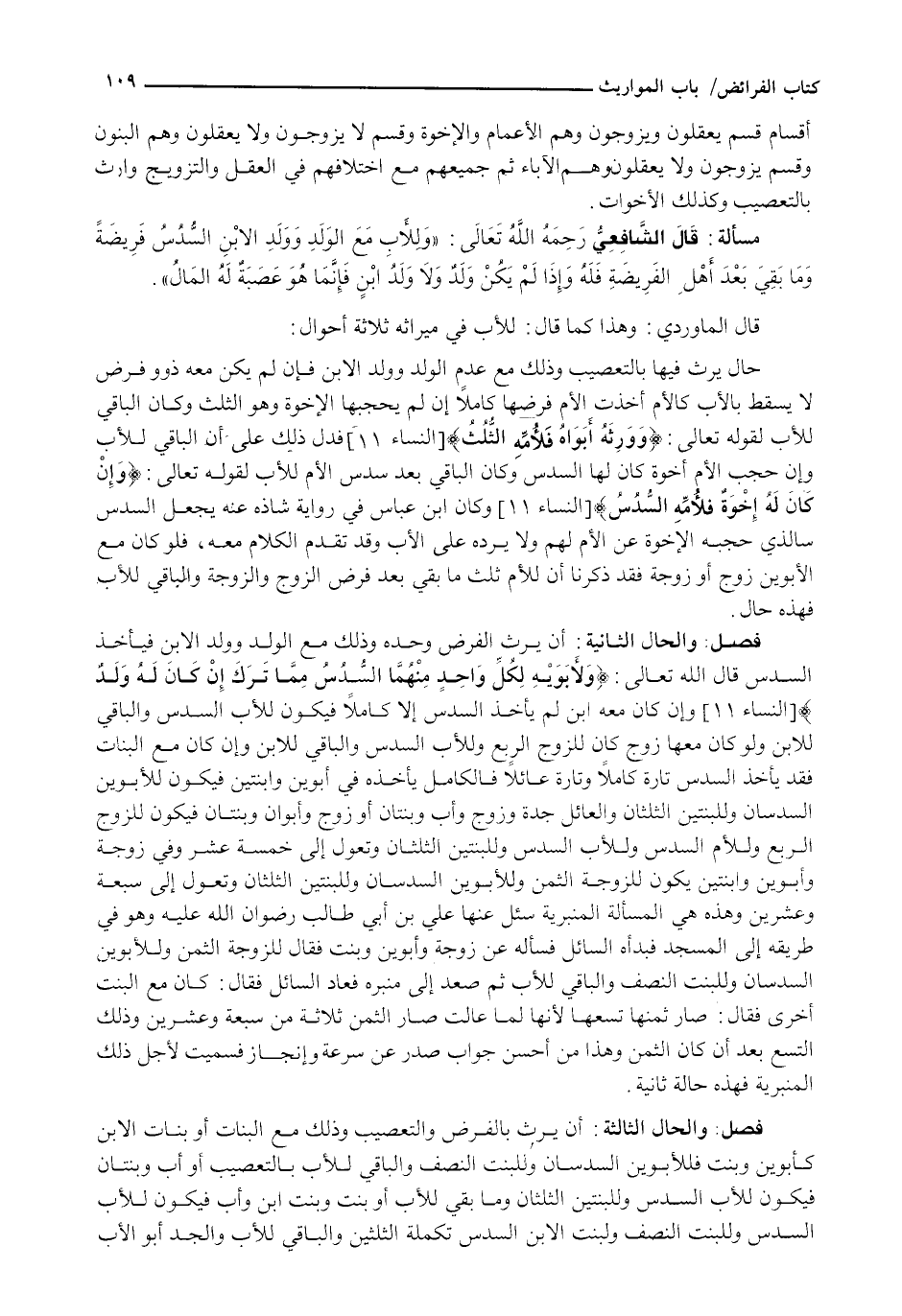 والحال الثانية: أن يرث الفرض وَحْدَهُ وَذَلِكَ مَعَ الْوَلَدِ وَوَلَدِ الِابْنِ فيأخذ السُّدُس قَالَ اللَّهُ تَعَالَى: {وَلأَبَوَيْهِ لِكُلِّ وَاحِدٍ مِنْهُمَا السُّدُسُ مِمَّا تَرَكَ إِنْ كَانَ لَهُ وَلَدٌ} [النساء: 11] وَإِنْ كَانَ مَعَهُ ابْنٌ لَمْ يَأْخُذِ السُّدُسَ إِلَّا كَامِلًا فَيَكُونُ لِلْأَبِ السُّدُسُ والباقي للابن ولو كان معها زَوْجٌ كَانَ لِلزَّوْجِ الرُّبُعُ وَلِلْأَبِ السُّدُسُ وَالْبَاقِي لِلِابْنِ وَإِنْ كَانَ مَعَ الْبَنَاتِ فَقَدْ يَأْخُذُ السُّدُسَ تَارَةً كَامِلًا وَتَارَةً عَائِلًا فَالْكَامِلُ يَأْخُذُهُ فِي أَبَوَيْنِ وَابْنَتَيْنِ فَيَكُونُ لِلْأَبَوَيْنِ السُّدُسَانِ وَلِلْبِنْتَيْنِ الثُّلُثَانِ وَالْعَائِلُ جَدَّةٌ وَزَوْجٌ وَأَبٌ وَبِنْتَانِ أَوْ زَوْجٌ وَأَبَوَانِ وَبِنْتَانِ فَيَكُونُ لِلزَّوْجِ الرُّبُعُ وَلِلْأُمِّ السُّدُسُ وَلِلْأَبِ السُّدُسُ وَلِلْبِنْتَيْنِ الثُّلُثَانِ وَتَعُولُ إِلَى خَمْسَةَ عَشَرَ وَفِي زَوْجَةٍ وَأَبَوَيْنِ وَابْنَتَيْنِ يَكُونُ لِلزَّوْجَةِ الثُّمُنُ وَلِلْأَبَوَيْنِ السُّدُسَانِ وَلِلْبِنْتَيْنِ الثُّلُثَانِ وَتَعُولُ إلى سبعة وعشرين وهذه هي المسألة الْمِنْبَرِيَّةُ سُئِلَ عَنْهَا عَلِيِّ بْنِ أَبِي طَالِبٍ رِضْوَانُ اللَّهِ عَلَيْهِ وَهُوَ فِي طَرِيقِهِ إِلَى الْمَسْجِدِ فَبَدْأَهُ السَّائِلُ فَسَأَلَهُ عَنْ زَوْجَةٍ وَأَبَوَيْنِ وَبِنْتٍ فَقَالَ لِلزَّوْجَةِ الثُّمُنُ وَلِلْأَبَوَيْنِ السُّدُسَانِ وَلِلْبِنْتِ النِّصْفُ وَالْبَاقِي لِلْأَبِ ثُمَّ صَعِدَ إِلَى مِنْبَرِهِ فَعَادَ السَّائِلُ فَقَالَ: كَانَ مَعَ الْبِنْتِ أُخْرَى فَقَالَ: صَارَ ثُمُنُهَا تُسْعُهَا لِأَنَّهَا لَمَّا عَالَتْ صَارَ الثُّمُنُ ثَلَاثَةً مِنْ سَبْعَةٍ وَعِشْرِينَ وَذَلِكَ التُّسْعُ بَعْدَ أَنْ كَانَ الثُّمُنُ وَهَذَا مِنْ أحسن جواب صدر عن سرعة وإنجاز فسميت لأجل ذلك المنبرية فهذه حال ثَانِيَةٌ.
