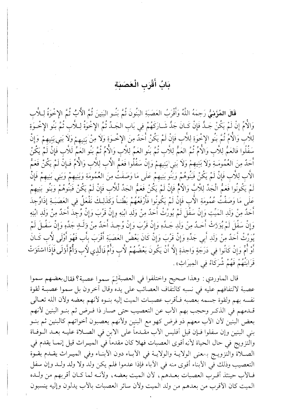 قال المزني رحمه الله وأقرب الْعَصَبَةِ الْبَنُونَ ثُمَّ بَنُو الْبَنِينَ ثُمَّ الْأَبُ ثم الإخوة للأب والأم إن لم يكن جد فإن كان جد شاركهم في باب الجد ثُمَّ الْإِخْوَةُ لِلْأَبِ ثُمَّ بَنُو الْإِخْوَةِ لِلْأَبِ والأم ثم بنو الإخوة للأب فإن لم يكن أحد من الإخوة ولا من بينهم ولا بني بنيهم وإن سفلوا فالعم للأب والأم ثم العم للأب ثم بنو العم للأب والأم ثم بنو العم للأب فإن لم يكن أحد من العمومة ولا بنيهم ولا بني بنيهم وإن سفلوا فعم الأب للأب والأم فإن لم يكن فعم الأب للأب فإن لم يكن فبنوهم وبنو بنيهم على ما وصفت من العمومة وبنيهم وبني بنيهم فإن لم يكونوا فعم الجد للأب والأم فإن لم يكن فعم الجد للأب فإن لم يكن فبنوهم وبنو بنيهم على ما وصفت عمومة الأب فإن لم يكونوا فأرفعهم بطنا وكذلك نفعل في العصبة إذا وجد أحد من ولد الميت وإن سفل لم يورث أحد من ولد ابنه وإن قرب وإن وجد أحد من ولد ابنه وإن سفل لم يورث أحد من ولد جده وإن قرب وإن وجد أحد من ولد جده وإن سفل لم يورث أحد من ولد أبي جده وإن قرب وإن كان بعض العصبة أقرب بأب فهو أولى لأب كان أو أم وإن كانوا في درجة واحدة إلا أن يكون بعضهم لأب وأم فالذي لأب وأم أولى فإذا استوت قرابتهم فهم شركاء في الميراث ".