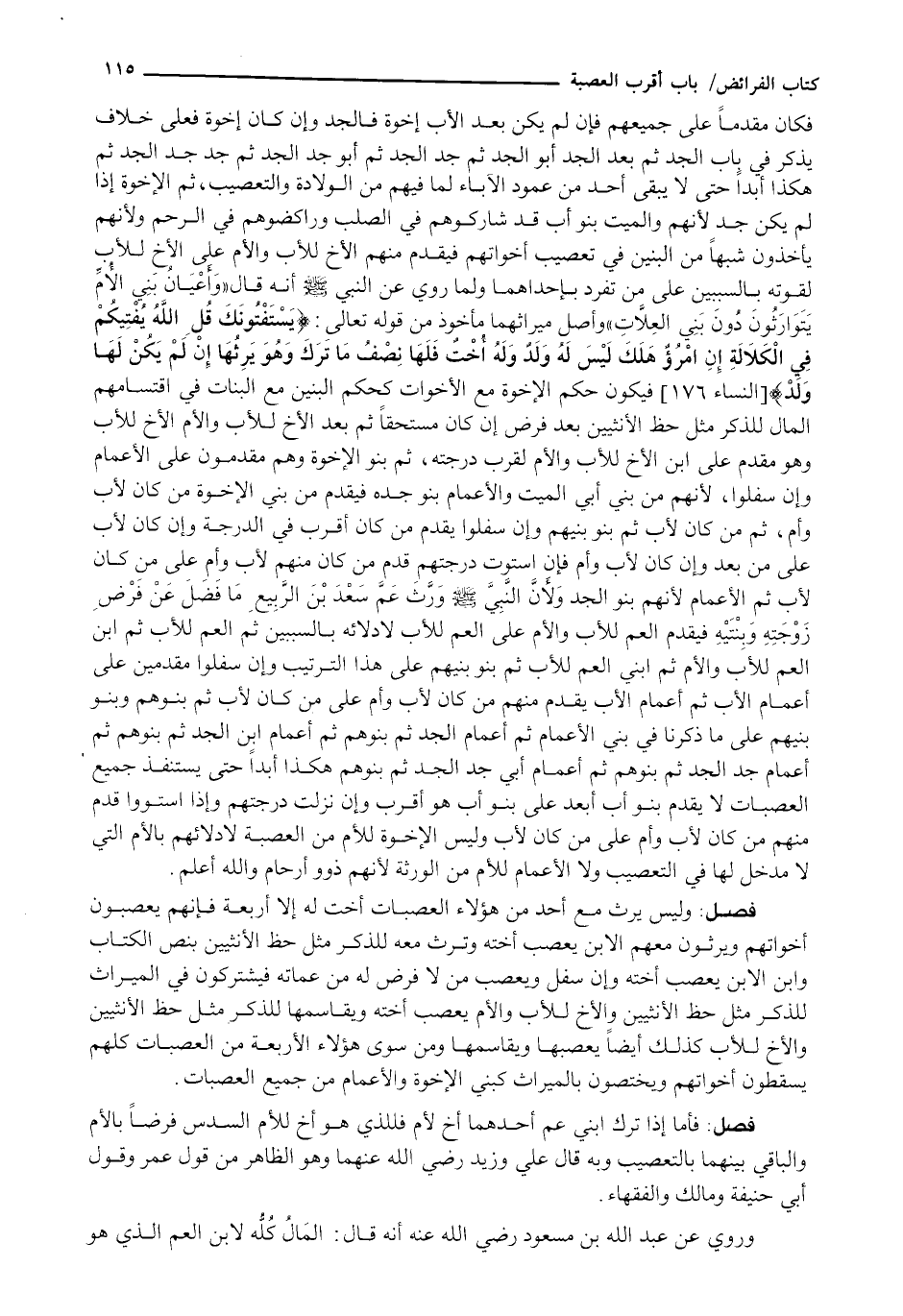 فَكَانَ مُقَدَّمًا عَلَى جَمِيعِهِمْ فَإِنْ لَمْ يَكُنْ بَعْدَ الْأَبِ إِخْوَةٌ فَالْجَدُّ وَإِنْ كَانَ إِخْوَةٌ فَعَلَى خِلَافٍ يُذْكَرُ فِي بِابِ الْجَدِّ ثُمَّ بَعْدَ الْجَدِّ أَبُو الْجَدِّ ثُمَّ جَدُّ الْجَدِّ ثُمَّ أَبُو جَدِّ الْجَدِّ ثُمَّ جَدُّ جَدِّ الْجَدِّ ثُمَّ هَكَذَا أَبَدًا حَتَّى لَا يَبْقَى أَحَدٌ مِنْ عَمُودِ الْآبَاءِ لِمَا فِيهِمْ مِنَ الْوِلَادَةِ وَالتَّعْصِيبِ، ثُمَّ الْإِخْوَةُ إِذَا لَمْ يَكُنْ جَدٌّ لِأَنَّهُمْ وَالْمَيِّتُ بَنُو أَبٍ قَدْ شَارَكُوهُمْ فِي الصُّلْبِ وَرَاكَضُوهُمْ فِي الرَّحِمِ وَلِأَنَّهُمْ يَأْخُذُونَ شَبَهًا مِنَ الْبَنِينِ فِي تَعْصِيبِ أَخَوَاتِهِمْ فَيُقَدَّمُ مِنْهُمُ الْأَخُ لِلْأَبِ وَالْأُمِّ عَلَى الْأَخِ لِلْأَبِ لقوته بالسببين على من تفرد بإحداهما وَلِمَا رُوِيَ عَنِ النَّبِيِّ - صَلَّى اللَّهُ عَلَيْهِ وَسَلَّم َ - أنه قال: " وأعيان بني الأم يتوارثون دون بني العلات " وأصل ميراثهما مَأْخُوذٌ مِنْ قَوْله تَعَالَى: {يَسْتَفْتُونَكَ قُلِ اللَّهُ يُفْتِيكُمْ فِي الْكَلالَةِ إِنِ امْرُؤٌ هَلَكَ لَيْسَ لَهُ وَلَدٌ وَلَهُ أُخْتٌ فَلَهَا نِصْفُ مَا تَرَكَ وَهُوَ يَرِثُهَا إِنْ لَمْ يَكُنْ لَهَا وَلَدٌ} [النساء: 176] فَيَكُونُ حُكْمُ الْإِخْوَةِ مَعَ الْأَخَوَاتِ كَحُكْمِ الْبَنِينَ مَعَ الْبَنَاتِ فِي اقْتِسَامِهِمُ الْمَالَ لِلذَّكَرِ مِثْلُ حَظِّ الْأُنْثَيَيْنِ بَعْدَ فَرْضٍ إِنْ كَانَ مُسْتَحِقًّا ثُمَّ بَعْدَ الْأَخِ لِلْأَبِ وَالْأُمِّ الْأَخُ لِلْأَبِ وَهُوَ مُقَدَّمٌ عَلَى ابْنِ الْأَخِ لِلْأَبِ وَالْأُمِّ لِقُرْبِ دَرَجَتِهِ، ثُمَّ بَنُو الْإِخْوَةِ وَهُمْ مُقَدَّمُونَ عَلَى الْأَعْمَامِ وَإِنْ سَفَلُوا، لِأَنَّهُمْ من بني أبي الْمَيِّتِ وَالْأَعْمَامُ بَنُو جَدِّهِ فَيُقَدَّمُ مِنْ بَنِي الْإِخْوَةِ مَنْ كَانَ لِأَبٍ وَأُمٍّ، ثُمَّ مَنْ كَانَ لِأَبٍ ثُمَّ بَنُو بَنِيهِمْ وَإِنْ سَفَلُوا يُقَدَّمُ مَنْ كَانَ أَقْرَبَ فِي الدَّرَجَةِ وَإِنْ كَانَ لِأَبٍ عَلَى مَنْ بَعُدَ وَإِنْ كَانَ لِأَبٍ وَأُمٍّ فَإِنِ اسْتَوَتْ دَرَجَتُهُمْ قُدِّمَ مَنْ كَانَ مِنْهُمْ لِأَبٍ وَأُمٍّ عَلَى مَنْ كَانَ لِأَبٍ ثُمَّ الْأَعْمَامُ لِأَنَّهُمْ بَنُو الْجَدِّ وَلِأَنَّ النبي - صَلَّى اللَّهُ عَلَيْهِ وَسَلَّم َ - وَرَّثَ عَمَّ سَعْدِ بْنِ الرَّبِيعِ مَا فَضَلَ عَنْ فَرْضِ زَوْجَتِهِ وَبِنْتَيْهِ فَيُقَدَّمُ الْعَمُّ لِلْأَبِ وَالْأُمِّ عَلَى الْعَمِّ لِلْأَبِ لِإِدْلَائِهِ بِالسَّبَبَيْنِ ثُمَّ الْعَمُّ لِلْأَبِ ثُمَّ ابْنُ الْعَمِّ لِلْأَبِ وَالْأُمِّ ثم ابني الْعَمِّ لِلْأَبِ ثُمَّ بَنُو بَنِيهِمْ عَلَى هَذَا التَّرْتِيبِ وَإِنْ سَفَلُوا مُقَدَّمِينَ عَلَى أَعْمَامِ الْأَبِ ثُمَّ أَعْمَامُ الْأَبِ يُقَدَّمُ مِنْهُمْ مَنْ كَانَ لِأَبٍ وَأُمٍّ عَلَى مَنْ كَانَ لِأَبٍ ثُمَّ بَنُوهُمْ وَبَنُو بَنِيهِمْ عَلَى مَا ذَكَرْنَا فِي بَنِي الْأَعْمَامِ ثُمَّ أَعْمَامُ الْجَدِّ ثُمَّ بَنُوهُمْ ثم أعمام ابن الْجَدِّ ثُمَّ بَنُوهُمْ ثُمَّ أَعْمَامُ جَدِّ الْجَدِّ ثم بنوهم ثم أعمام أبي جَدِّ الْجَدِّ ثُمَّ بَنُوهُمْ هَكَذَا أَبَدًا حَتَّى يستنفذ جَمِيعُ الْعَصَبَاتِ لَا يُقَدَّمُ بَنُو أَبٍ أَبْعَدَ على بنو أب هو أقرب وإن نزلت درجتهم وَإِذَا اسْتَوَوْا قُدِّمَ مِنْهُمْ مَنْ كَانَ لِأَبٍ وَأُمٍّ عَلَى مَنْ كَانَ لِأَبٍ وَلَيْسَ الْإِخْوَةُ لِلْأُمِّ مِنَ الْعَصَبَةِ لِإِدْلَائِهِمْ بِالْأُمِّ الَّتِي لَا مَدْخَلَ لَهَا فِي التَّعْصِيبِ وَلَا الْأَعْمَامُ لِلْأُمِّ من الورثة لأنهم ذوو أرحام والله أعلم.