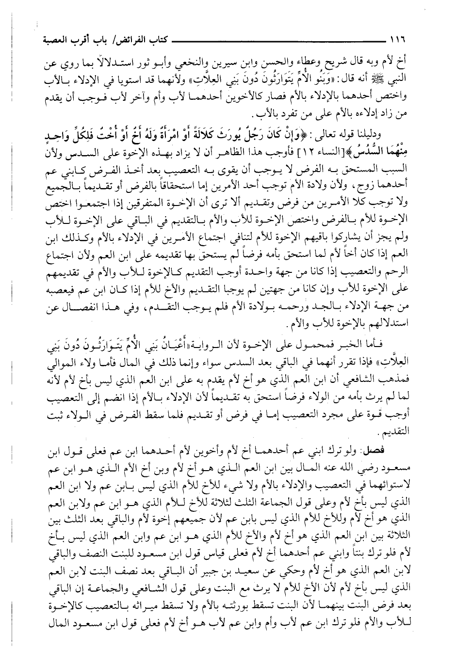 فَأَمَّا الْخَبَرُ فَمَحْمُولٌ عَلَى الْإِخْوَةِ لِأَنَّ الرِّوَايَةَ " أَعْيَانُ بَنِي الْأُمِّ يَتَوَارَثُونَ دُونَ بَنِي الْعَلَّاتِ " فَإِذَا تَقَرَّرَ أَنَّهُمَا فِي الْبَاقِي بَعْدَ السدس سواء وإنما ذلك فِي الْمَالِ فَأَمَّا وَلَاءُ الْمَوَالِي فَمَذْهَبُ الشَّافِعِيِّ أن ابن الْعَمِّ الَّذِي هُوَ أَخٌ لِأُمٍّ يُقَدَّمُ بِهِ عَلَى ابْنِ الْعَمِّ الَّذِي لَيْسَ بِأَخٍ لِأُمٍّ لِأَنَّهُ لَمَّا لَمْ يَرِثْ بِأُمِّهِ مِنَ الْوَلَاءِ فَرْضًا اسْتَحَقَّ بِهِ تَقْدِيمًا لِأَنَّ الْإِدْلَاءَ بِالْأُمِّ إِذَا انْضَمَّ إِلَى التَّعْصِيبِ أوجَبَ قُوَّةً عَلَى مُجَرَّدِ التَّعْصِيبِ إِمَّا فِي فَرْضٍ أَوْ تَقْدِيمٍ فَلَمَّا سَقَطَ الْفَرْضُ فِي الْوَلَاءِ ثَبَتَ التَّقْدِيمُ.