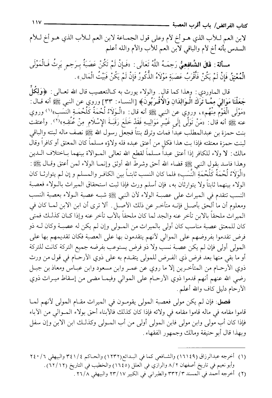 قال الشافعي رحمه الله تعالى: " فَإِنْ لَمْ يَكُنْ عَصَبَةً بِرَحِمٍ يَرِثُ فَالْمَوْلَى المعتق فإن لم تكن فَأَقْرَبُ عَصَبَةٍ مَوْلَاهُ الذُّكُورُ فَإِنْ لَمْ يَكُنْ فَبَيْتُ الْمَالِ ".