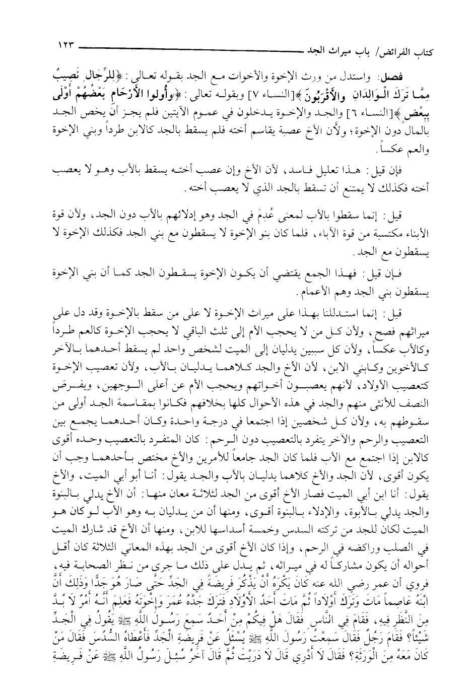 وَاسْتَدَلَّ مَنْ وَرَّثَ الْإِخْوَةَ وَالْأَخَوَاتِ مَعَ الْجَدِّ بِقَوْلِهِ تَعَالَى: {لِلرِّجَالِ نَصِيبٌ مِمَّا تَرَكَ الوالدان والأقربون} [النساء: 7] وبقوله تعالى: {وأولوا الأرحام بعضهم أولى ببعض} [النساء: 6] وَالْجَدُّ وَالْإِخْوَةُ يَدْخُلُونَ فِي عُمُومِ الْآيَتَيْنِ فَلَمْ يَجُزْ أَنْ يَخُصَّ الْجَدَّ بِالْمَالِ دُونَ الْإِخْوَةِ؛ وَلِأَنَّ الْأَخَ عَصَبَةٌ يُقَاسِمُ أُخْتَهُ فَلَمْ يَسْقُطْ بالجد كَالِابْنِ طَرْدًا وَبَنِي الْإِخْوَةِ وَالْعَمِّ عَكْسًا.