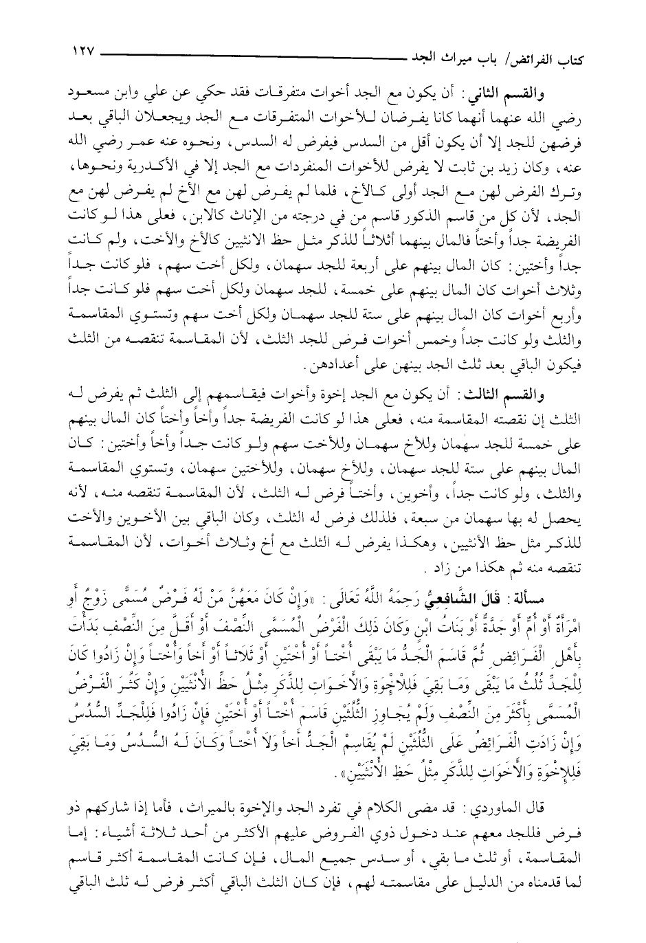 وَالْقِسْمُ الثَّالِثُ: أَنْ يَكُونَ مَعَ الْجَدِّ إِخْوَةٌ وَأَخَوَاتٌ فَيُقَاسِمُهُمْ إِلَى الثُّلُثِ ثُمَّ يَفْرِضُ لَهُ الثُّلُثَ إِنْ نَقَصَتْهُ الْمُقَاسَمَةُ مِنْهُ، فَعَلَى هَذَا لَوْ كَانَتِ الْفَرِيضَةُ جَدًّا وَأَخًا وَأُخْتًا كَانَ الْمَالُ بَيْنَهُمْ عَلَى خَمْسَةٍ لِلْجَدِّ سَهْمَانِ وَلِلْأَخِ سَهْمَانِ وَلِلْأُخْتِ سَهْمٌ وَلَوْ كَانَتْ جَدًّا وَأَخًا وَأُخْتَيْنِ: كَانَ الْمَالُ بَيْنَهُمْ عَلَى سِتَّةٍ لِلْجَدِّ سَهْمَانِ، وَلِلْأَخِ سَهْمَانِ، وللأختين سهمان، وَتَسْتَوِي الْمُقَاسَمَةُ وَالثُّلُثُ، وَلَوْ كَانَتْ جَدًّا، وَأَخَوَيْنِ، وَأُخْتًا فَرَضَ لَهُ الثُّلُثَ، لِأَنَّ الْمُقَاسَمَةَ تَنْقُصُهُ مِنْهُ، لِأَنَّهُ يَحْصُلُ لَهُ بِهَا سَهْمَانِ مِنْ سَبْعَةٍ، فَلِذَلِكَ فَرَضَ لَهُ الثُّلُثَ، وَكَانَ الْبَاقِي بين الأخوين والأخت للذكر مثل حظ الأنثيين، وَهَكَذَا يَفْرِضُ لَهُ الثُّلُثَ مَعَ أَخٍ وَثَلَاثِ أَخَوَاتٍ، لِأَنَّ الْمُقَاسَمَةَ تَنْقُصُهُ مِنْهُ ثُمَّ هَكَذَا من زاد.