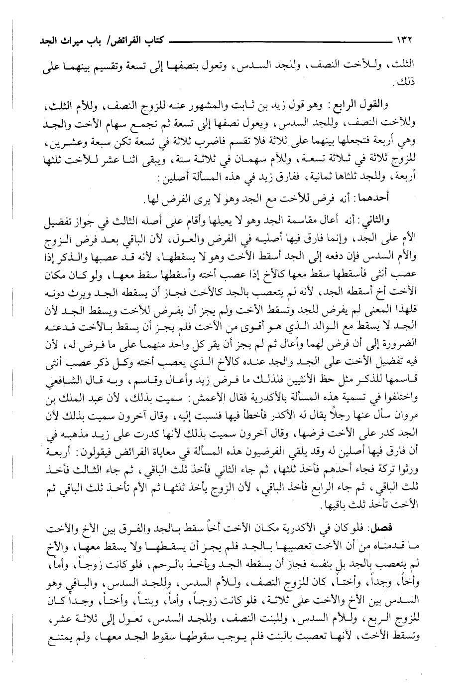 وَالثَّانِي: أَنَّهُ أَعَالَ مُقَاسَمَة الْجَدِّ وَهُوَ لَا يُعِيلُهَا وَأَقَامَ عَلَى أَصْلِهِ الثَّالِثِ فِي جَوَازِ تَفْضِيلِ الْأُمِّ عَلَى الْجَدِّ، وَإِنَّمَا فَارَقَ فِيهَا أَصْلَيْهِ فِي الْفَرْضِ وَالْعَوْلِ، لِأَنَّ الْبَاقِيَ بَعْدَ فَرْضِ الزَّوْجِ وَالْأُمِّ السُّدُسُ فَإِنْ دَفَعَهُ إِلَى الْجَدِّ أَسْقَطَ الْأُخْتَ وَهُوَ لَا يُسْقِطُهَا، لِأَنَّهُ قَدْ عَصَّبَهَا وَالذَّكَرُ إِذَا عَصَّبَ أُنْثَى فَأَسْقَطَهَا سَقَطَ مَعَهَا كَالْأَخِ إِذَا عَصَّبَ أُخْتَهُ وَأَسْقَطَهَا سَقَطَ مَعَهَا، وَلَوْ كَانَ مَكَانُ الْأُخْتِ أَخٌ أَسْقَطَهُ الْجَدُّ، لِأَنَّهُ لم يتعصب بالجد كالأخت فجاز أن يسقطه الجد وَيَرِثَ دُونَهُ فَلِهَذَا الْمَعْنَى لَمْ يَفْرِضْ لِلْجَدِّ وَتَسْقُطُ الْأُخْتُ وَلَمْ يَجُزْ أَنْ يَفْرِضَ لِلْأُخْتِ وَيَسْقُطُ الْجَدُّ لِأَنَّ الْجَدَّ لَا يَسْقُطُ مَعَ الوالد الَّذِي هُوَ أَقْوَى مِنَ الْأُخْتِ فَلَمْ يَجُزْ أَنْ يَسْقُطَ بِالْأُخْتِ فَدَعَتْهُ الضَّرُورَةُ إِلَى أَنْ فَرَضَ لَهُمَا وَأَعَالَ ثُمَّ لَمْ يَجُزْ أَنْ يُقِرَّ كُلَّ وَاحِدٍ مِنْهُمَا عَلَى مَا فَرَضَ لَهُ، لِأَنَّ فِيهِ تَفْضِيلَ الْأُخْتِ عَلَى الْجَدِّ وَالْجَدُّ عِنْدَهُ كَالْأَخِ الَّذِي يُعَصِّبُ أُخْتَهُ وَكُلُّ ذَكَرٍ عَصَّبَ أُنْثَى قَاسَمَهَا لِلذَّكَرِ مِثْلُ حَظِّ الأنثيين فلذلك ما فَرَضَ زَيْدٌ وَأَعَالَ وَقَاسَمَ، وَبِهِ قَالَ الشَّافِعِيُّ واختلفوا في تسمية هذه المسألة بالأكدرية فَقَالَ الْأَعْمَشُ: سُمِّيَتْ بِذَلِكَ، لِأَنَّ عَبْدَ الْمَلِكِ بْنَ مَرْوَانَ سَأَلَ عَنْهَا رَجُلًا يُقَالُ لَهُ الْأَكْدَرُ فَأَخْطَأَ فِيهَا فَنُسِبَتْ إِلَيْهِ، وَقَالَ آخَرُونَ سُمِّيَتْ بِذَلِكَ لِأَنَّ الْجَدَّ كَدَّرَ عَلَى الْأُخْتِ فَرْضَهَا، وَقَالَ آخَرُونَ سُمِّيَتْ بِذَلِكَ لِأَنَّهَا كَدَّرَتْ عَلَى زَيْدٍ مَذْهَبَهُ فِي أَنْ فَارَقَ فِيهَا أَصْلَيْنِ لَهُ وَقَدْ يُلْقِي الْفَرْضِيُّونَ هَذِهِ الْمَسْأَلَةَ فِي مُعَايَاةِ الْفَرَائِضِ فَيَقُولُونَ: أَرْبَعَةٌ وَرِثُوا تَرِكَةً فَجَاءَ أَحَدُهُمْ فَأَخَذَ ثُلُثَهَا، ثُمَّ جَاءَ الثَّانِي فَأَخَذَ ثُلُثَ الْبَاقِي، ثُمَّ جَاءَ الثَّالِثُ فَأَخَذَ ثُلُثَ الْبَاقِي، ثُمَّ جَاءَ الرَّابِعُ فَأَخَذَ الْبَاقِي، لِأَنَّ الزَّوْجَ يَأْخُذُ ثُلُثَهَا ثُمَّ الْأُمُّ تَأْخُذُ ثُلُثَ الْبَاقِي ثُمَّ الْأُخْتُ تَأْخُذُ ثُلُثَ بَاقِيهَا.