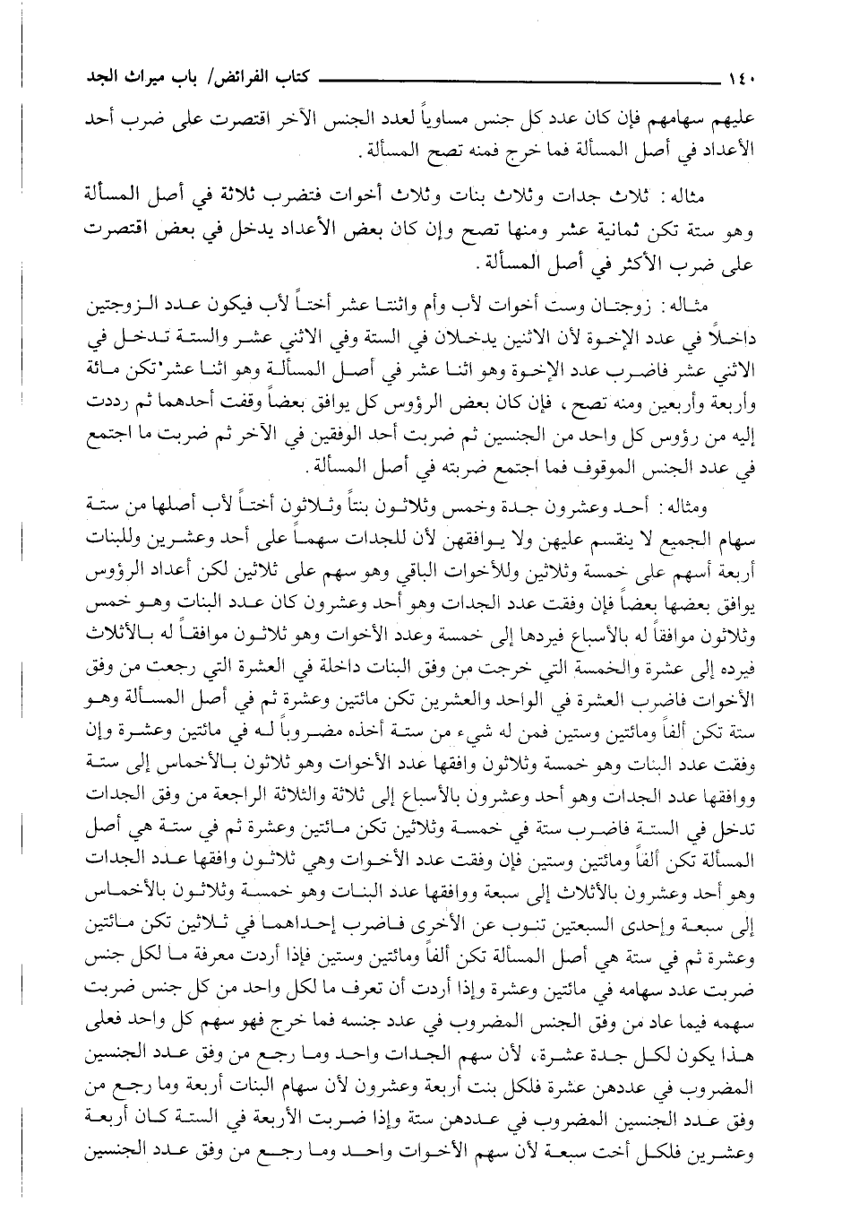 سَهْمَهُ فِيمَا عَادَ مِنْ وفق الجنس الْمَضْرُوبِ فِي عَدَدِ جِنْسِهِ فَمَا خَرَجَ فَهُوَ سَهْمُ كُلِّ وَاحِدٍ فَعَلَى هَذَا يَكُونُ لِكُلِّ جَدَّةٍ عَشَرَةٌ، لِأَنَّ سَهْمَ الْجَدَّاتِ وَاحِدٌ وَمَا رَجَعَ مِنْ وَفْقِ عَدَدِ الْجِنْسَيْنِ الْمَضْرُوبِ فِي عَدَدِهِنَّ عَشَرَةٌ فَلِكُلِّ بِنْتٍ أَرْبَعَةٌ وَعِشْرُونَ لِأَنَّ سِهَامَ الْبَنَاتِ أَرْبَعَةٌ وَمَا رَجَعَ مِنْ وَفْقِ عَدَدِ الْجِنْسَيْنِ الْمَضْرُوبِ فِي عَدَدِهِنَّ سِتَّةٌ وَإِذَا ضُرِبَتِ الْأَرْبَعَةُ فِي السِّتَّةِ كَانَ أَرْبَعَةً وَعِشْرِينَ فلكل أُخْتٍ سَبْعَةٌ لِأَنَّ سَهْمَ الْأَخَوَاتِ وَاحِدٌ وَمَا رَجَعَ مِنْ وَفْقِ عَدَدِ الْجِنْسَيْنِ