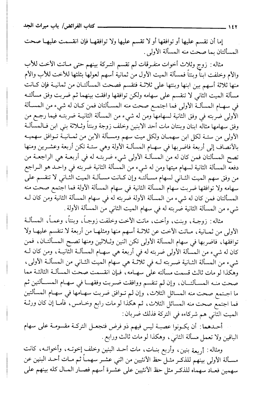 مِثَالُهُ: زوج وثلاث أخوات متفرقات لَمْ تُقَسَّمِ التَّرِكَةُ بَيْنَهُمْ حَتَّى مَاتَتِ الْأُخْتُ لِلْأَبِ وَالْأُمِّ وَخَلَّفَتِ ابْنًا وَبِنْتًا فَمَسْأَلَةُ الْمَيِّتِ الْأول مِنْ ثَمَانِيَةِ أَسْهُمٍ لِعَوْلِهَا بِثُلُثِهَا لِلْأُخْتِ للأب والأم منها ثلاثة أسهم بين ابنا وبنتها على ثلاثة فتقسم فصحت المسألتان من ثمانية فإن كَانَتْ مَسْأَلَةُ الْمَيِّتِ الثَّانِي لَا تَنْقَسِمُ عَلَى سِهَامِهِ وَلَكِنْ تُوَافِقُهَا وَافَقَتْ بَيْنَهُمَا ثُمَّ ضَرَبْتَ وَفْقَ مَسْأَلَتِهِ فِي سِهَامِ الْمَسْأَلَةِ الْأُولَى فَمَا اجْتَمَعَ صَحَّتْ مِنْهُ الْمَسْأَلَتَانِ فَمَنْ كَانَ لَهُ شَيْءٌ مِنَ الْمَسْأَلَةِ الْأُولَى ضَرَبْتَهُ فِي وَفْقِ الثَّانِيَةِ لِسِهَامِهَا وَمِنْ لَهُ شَيْءٌ مِنَ الْمَسْأَلَةِ الثَّانِيَةِ ضَرَبْتَهُ فِيمَا رَجَعَ مِنْ وَفْقِ سِهَامِهَا مِثَالُهُ ابْنَانِ وَبِنْتَانِ مَاتَ أَحَدُ الِابْنَيْنِ وَخَلَّفَ زَوْجَةً وَبِنْتًا وَثَلَاثَةً بَنِي ابْنٍ فَالْمَسْأَلَةُ الْأُولَى من ستة لكل ابن سهمان ولكل ميت سَهْمٌ وَمَسْأَلَةُ الِابْنِ مِنْ ثَمَانِيَةٍ تُوَافِقُ سَهْمَيْهِ بِالْأَنْصَافِ إِلَى أَرْبَعَةٍ فَاضْرِبْهَا فِي سِهَامِ الْمَسْأَلَةِ الأولة وَهِيَ سِتَّةٌ تَكُنْ أَرْبَعَةً وَعِشْرِينَ وَمِنْهَا تَصِحُّ الْمَسْأَلَتَانِ فَمَنْ كَانَ لَهُ مِنَ الْمَسْأَلَةِ الْأُولَى شَيْءٌ ضَرَبْتَهُ لَهُ فِي أَرْبَعَةٍ هِيَ الرَّاجِعَةُ من دفعه الْمَسْأَلَةَ الثَّانِيَةَ لِسِهَامِ مَيِّتِهَا وَمَنْ لَهُ شَيْءٌ من المسألة الثانية ضربته فِي وَاحِدٍ هُوَ الرَّاجِعُ مِنْ وَفْقِ سَهْمِ الْمَيِّتِ الثَّانِي لِسِهَامِ مَسْأَلَتِهِ وَإِنْ كَانَتْ مَسْأَلَةُ الْمَيِّتِ الثَّانِي لَا تَنْقَسِمُ عَلَى سِهَامِهِ وَلَا تُوَافِقُهَا ضَرَبْتَ سِهَامَ الْمَسْأَلَةِ الثَّانِيَةِ فِي سِهَامِ الْمَسْأَلَةِ الْأُولَى فَمَا اجْتَمَعَ صَحَّتْ مِنْهُ الْمَسْأَلَتَانِ فمن كان له شيء من المسألة الأولة ضَرَبْتَهُ لَهُ فِي سِهَامِ الْمَسْأَلَةِ الثَّانِيَةِ وَمَنْ كَانَ لَهُ شَيْءٌ مِنَ الْمَسْأَلَةِ الثَّانِيَةِ ضَرَبْتَهُ لَهُ فِي سِهَامِ الْمَيِّتِ الثَّانِي مِنَ الْمَسْأَلَةِ الأولة.
