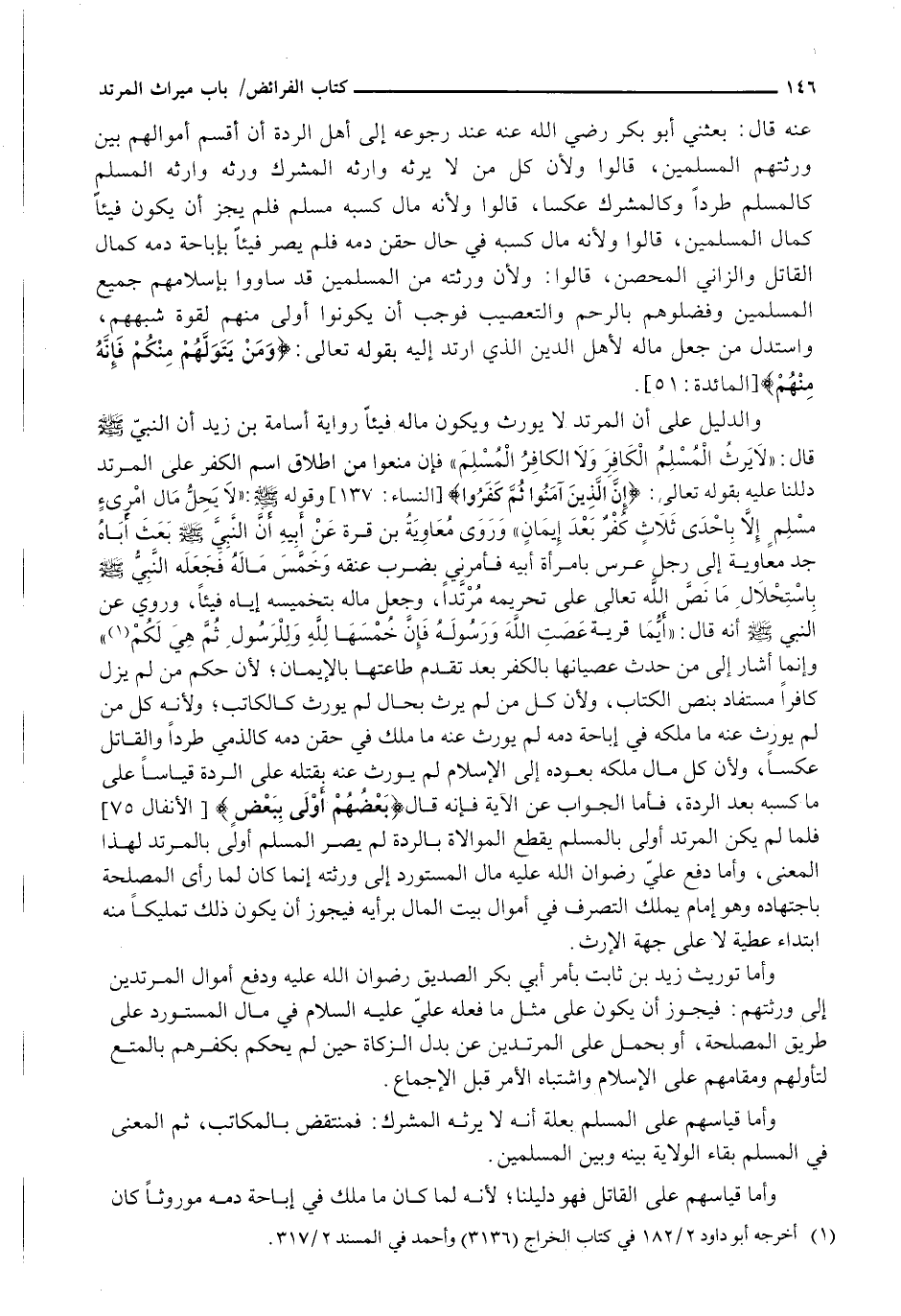 عَنْهُ قَالَ: بَعَثَنِي أَبُو بَكْرٍ رَضِيَ اللَّهُ عَنْهُ عِنْدَ رُجُوعِهِ إِلَى أَهْلِ الرِّدَّةِ أَنْ أُقَسِّمَ أَمْوَالَهُمْ بَيْنَ وَرَثَتِهِمُ الْمُسْلِمِينَ، قَالُوا وَلِأَنَّ كُلَّ مَنْ لَا يَرِثُهُ وَارِثُهُ الْمُشْرِكُ وَرِثَهُ وَارِثُهُ الْمُسْلِمُ كَالْمُسْلِمِ طَرْدًا وَكَالْمُشْرِكِ عَكْسًا، قَالُوا وَلِأَنَّهُ مَالٌ كَسَبَهُ مُسْلِمٌ فَلَمْ يَجُزْ أَنْ يكون فيئا كمال المسلمين، قَالُوا وَلِأَنَّهُ مَالٌ كَسَبَهُ فِي حَالِ حَقْنِ دَمِهِ فَلَمْ يَصِرْ فَيْئًا بِإِبَاحَةِ دَمِهِ كَمَالِ الْقَاتِلِ وَالزَّانِي الْمُحْصَنِ، قَالُوا: وَلِأَنَّ وَرَثَتَهُ مِنَ الْمُسْلِمِينَ قَدْ سَاوَوْا بِإِسْلَامِهِمْ جَمِيعَ الْمُسْلِمِينَ وَفَضَّلُوهُمْ بِالرَّحِمِ وَالتَّعْصِيبِ فَوَجَبَ أَنْ يَكُونُوا أَوْلَى مِنْهُمْ لقوة شبههم، وَاسْتَدَلَّ مَنْ جَعَلَ مَالَهُ لِأَهْلِ الدِّينِ الَّذِي ارتد إليه بقول تَعَالَى: {وَمَنْ يَتَوَلَّهُمْ مِنْكُمْ فَإِنَّهُ مِنْهُمْ} [المائدة: 51] .