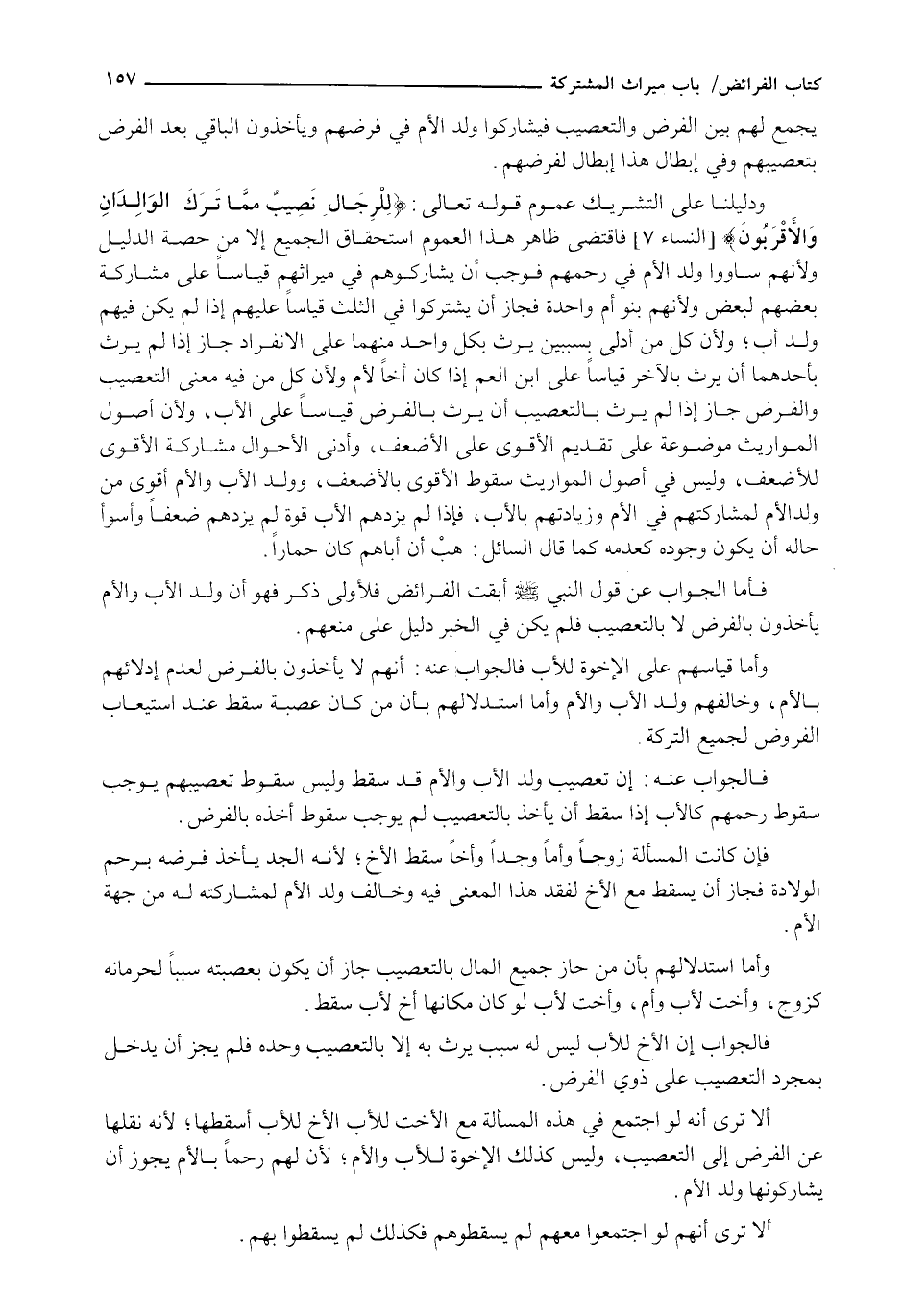 وَأَمَّا قِيَاسُهُمْ عَلَى الْإِخْوَةِ لِلْأَبِ فَالْجَوَابُ عَنْهُ: أَنَّهُمْ لَا يَأْخُذُونَ بِالْفَرْضِ لِعَدَمِ إِدْلَائِهِمْ بِالْأُمِّ، وَخَالَفَهُمْ وَلَدُ الْأَبِ وَالْأُمِّ وَأَمَّا اسْتِدْلَالُهُمْ بِأَنَّ مَنْ كَانَ عَصَبَةً سَقَطَ عِنْدَ اسْتِيعَابِ الْفُرُوضِ لِجَمِيعِ التَّرِكَةِ.