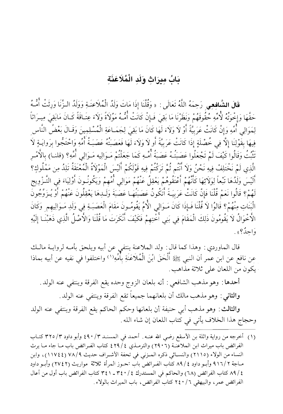 قال الشافعي رحمه الله تعالى: " وقلنا إِذَا مَاتَ وَلَدُ الْمُلَاعَنَةِ وَوَلَدُ الزِّنَا وَرِثَتْ أُمُّهُ حَقَّهَا وَإِخْوَتُهُ لِأُمِّهِ حُقُوقَهُمْ وَنَظَرْنَا مَا بَقِيَ فَإِنْ كَانَتْ أُمُّهُ مَوْلَاةَ وَلَاءِ عَتَاقَةٍ كان ما بقي ميراثا لموالي أمه وإن كانت عَرَبِيَّةً أَوْ لَا وَلَاءَ لَهَا كَانَ مَا بقي لجماعة المسلمين وقال بعض الناس فيها بقولنا إلا في خصلة إذا كانت عربية أو لا ولاء لها فعصبته عصبة أمه واحتجوا برواية لا تثبت وقالوا كيف لم تجعلوا عصبته عصبة أمه كما جعلتم مواليه موالي أمه؟ (قلنا) بالأمر الذي لم نختلف فيه نحن ولا أنتم ثم تركتم فيه قولكم أليس المولاة المعتقة تلد من مملوك؟ أليس ولدها تبعا لولائها كأنهم أعتقوهم يعقل عنهم موالي أمهم ويكونون أولياء في التزويج لهم؟ قالوا نعم قلنا فإن كانت عربية أتكون عصبتها عصبة ولدها يعقلون عنهم أو يزوجون البنات منهم؟ قالوا لا قلنا فإذا كان موالي الأم يقومون مقام العصبة في ولد مواليهم وكان الأخوال لا يقومون ذلك المقام في بني أختهم فكيف أنكرت ما قلنا والأصل الذي ذهبنا إليه واحد؟ ".