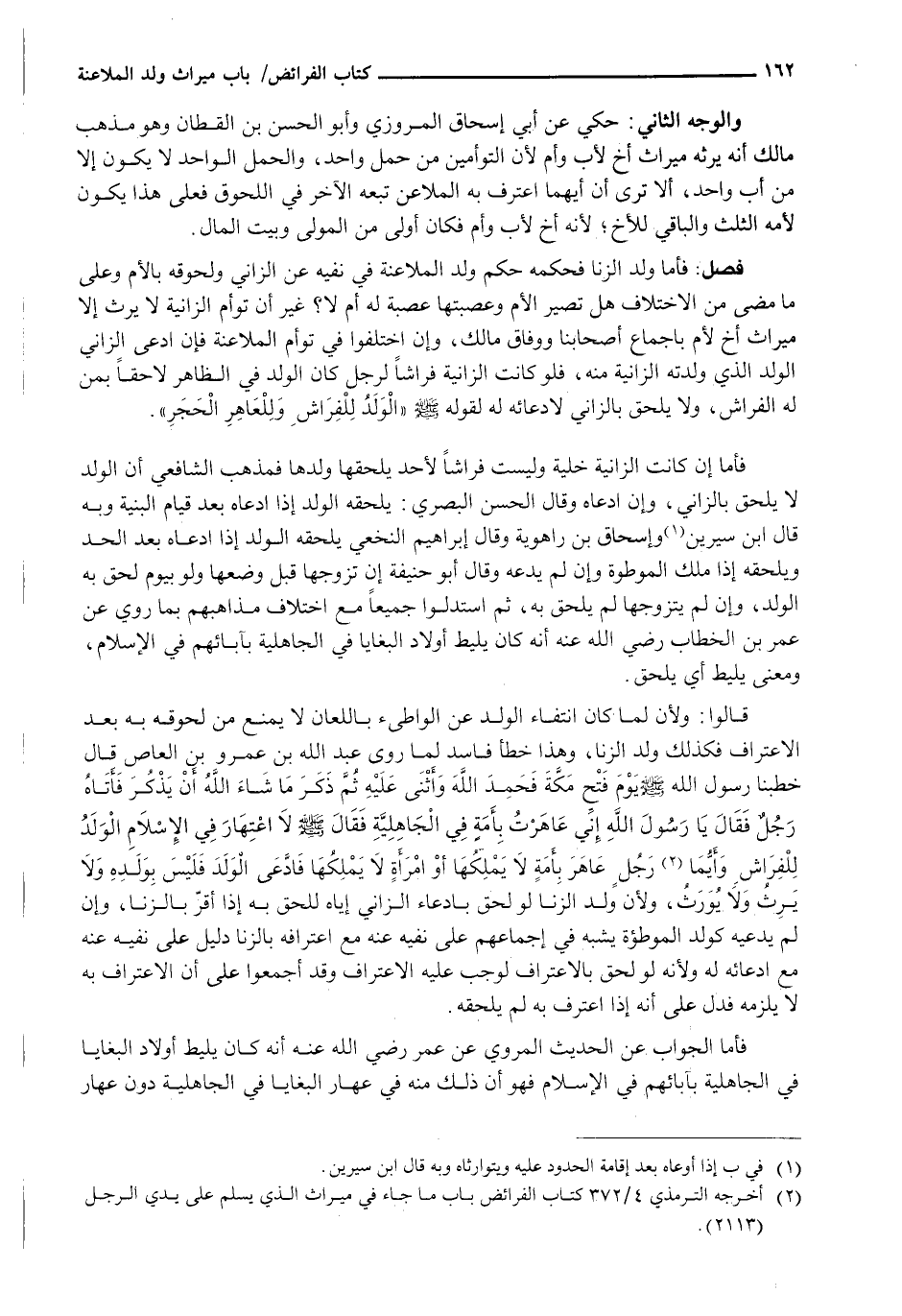 فَأَمَّا وَلَدُ الزِّنَا فَحُكْمُهُ حُكْمُ وَلَدِ الْمُلَاعَنَةِ فِي نَفْيِهِ عَنِ الزَّانِي ولحوقه بالأم وعلى مَا مَضَى مِنَ الِاخْتِلَافِ هَلْ تَصِيرُ الْأُمُّ وَعَصَبَتُهَا عَصَبَةً لَهُ أَمْ لَا؟ غَيْرَ أَنَّ تَوْأَمَ الزَّانِيَةِ لَا يَرِثُ إِلَّا مِيرَاثَ أَخٍ لِأُمٍّ بِإِجْمَاعِ أَصْحَابِنَا وَوِفَاقِ مَالِكٍ، وَإِنِ اخْتَلَفُوا فِي تَوْأَمِ الْمُلَاعَنَةِ فَإِنِ ادَّعَى الزَّانِي الْوَلَدَ الَّذِي وَلَّدَتْهُ الزَّانِيَةُ مِنْهُ، فَلَوْ كَانَتِ الزَّانِيَةُ فِرَاشًا لِرَجُلٍ كَانَ الْوَلَدُ فِي الظَّاهِرِ لَاحِقًا بِمَنْ لَهُ الْفِرَاشُ، وَلَا يَلْحَقُ بِالزَّانِي لِادِّعَائِهِ له لقوله - صَلَّى اللَّهُ عَلَيْهِ وَسَلَّم َ -: " الْوَلَدُ لِلْفِرَاشِ وَلِلْعَاهِرِ الْحَجَرُ ".