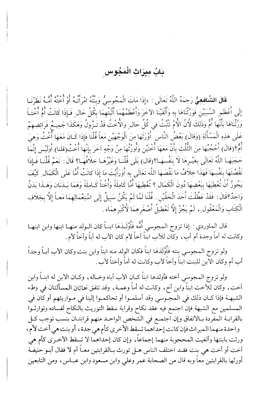 قال الشافعي رحمه الله تعالى: " إذا مات المجوسي وَبِنْتُهُ امْرَأَتُهُ أَوْ أُخْتُهُ أُمُّهُ نَظَرْنَا إِلَى أعظم السببين فورثناها به وألقينا الْآخَرَ وَأَعْظَمُهُمَا أَثْبَتُهُمَا بِكُلِّ حَالٍ فَإِذَا كَانَتْ أم أختا ورثناها بأنها أم وذلك لِأَنَّ الْأُمَّ تَثْبُتُ فِي كُلِّ حَالٍ وَالْأُخْتُ قد تزول وهكذا جميع فرائضهم على هذه المسألة (وقال) بعض الناس أورثها من الوجهين معا قلنا فإذا كان معها أخت وهي أم؟ (قال) أحجبها من الثلث بأن معها أختين وأورثها من وجه آخر بإنها أخت (قلنا) أوليس إنما حجبها الله تعالى بغيرها لا بنفسها؟ (قال) بلى قلنا وغيرها خلافها؟ قال: نعم قلنا فإذا نقصتها بنفسها فهذا خلاف ما نقصها الله تعالى به أورأيت ما إذا كانت أما على الكمال كيف يجوز أن تعطيها ببعضها دون الكمال؟ تعطيها أما كاملة وأختا كاملة وهما بدنان وهذا بدن واحد؟ قال: فقد عطلت أحد الحقين. قلنا لما لم يكن سبيل إلى استعمالهما معا إلا بخلاف الكتاب والمعقول، لم يجز إلا تعطيل أصغرهما لأكبرهما ".