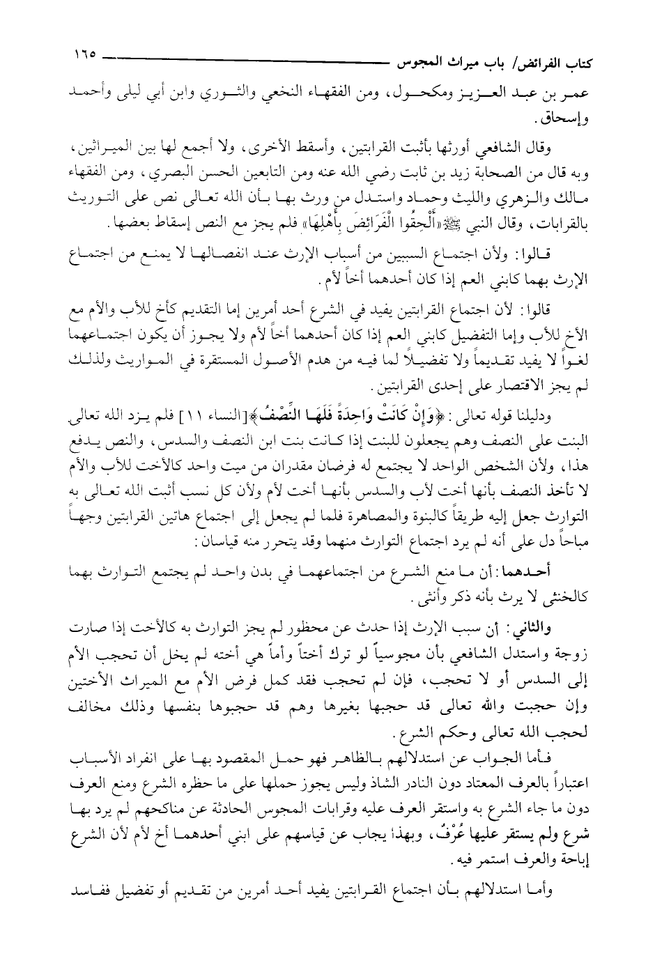 فَأَمَّا الْجَوَابُ عَنِ اسْتِدْلَالِهِمْ بِالظَّاهِرِ فَهُوَ حَمْلُ الْمَقْصُودِ بِهَا عَلَى انْفِرَادِ الْأَسْبَابِ اعْتِبَارًا بِالْعُرْفِ الْمُعْتَادِ دُونَ النادر الشاذ وليس يَجُوزُ حَمْلُهَا عَلَى مَا حَظَرَهُ الشَّرْعُ وَمَنَعَ الْعُرْفُ دُونَ مَا جَاءَ الشَّرْعُ بِهِ وَاسْتَقَرَّ الْعُرْفُ عَلَيْهِ وَقُرَابَاتُ الْمَجُوسِ الْحَادِثَةِ عَنْ مَنَاكِحِهِمْ لَمْ يَرِدْ بِهَا شَرْعٌ وَلَمْ يَسْتَقِرَّ عَلَيْهَا عُرْفٌ، وَبِهَذَا يُجَابُ عَنْ قِيَاسِهِمْ عَلَى ابْنَيْ أَحَدِهِمَا أَخٌ لِأُمٍّ لِأَنَّ الشَّرْعَ أَبَاحَهُ وَالْعُرْفَ اسْتَمَرَّ فِيهِ.