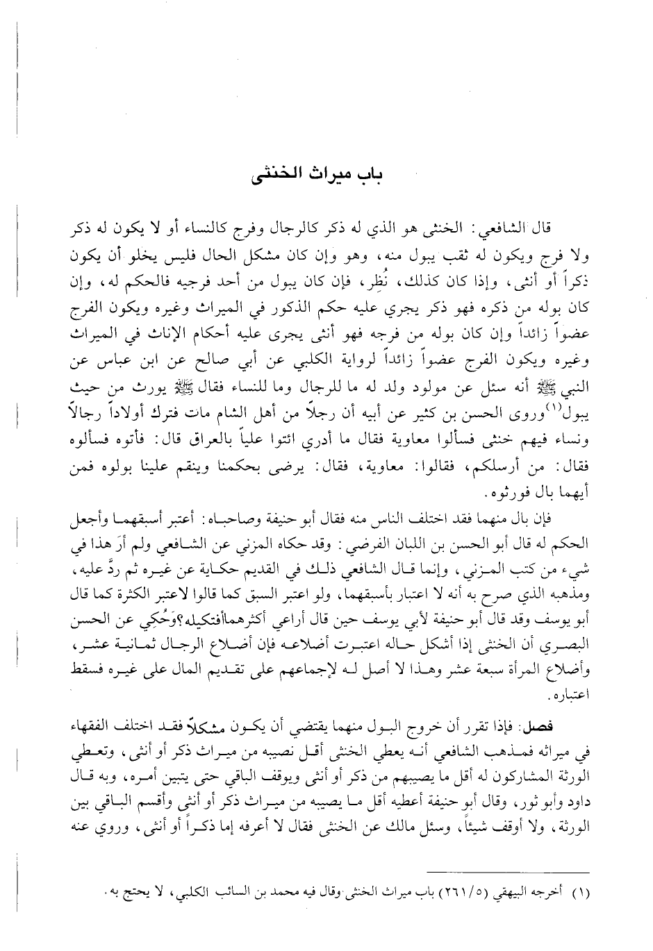 قال الشافعي: الْخُنْثَى هُوَ الَّذِي لَهُ ذَكَرٌ كَالرِّجَالِ وَفَرْجٌ كَالنِّسَاءِ أَوْ لَا يَكُونُ لَهُ ذَكَرٌ وَلَا فرج ويكون له ثُقْبٌ يَبُولُ مِنْهُ، وَهُوَ وَإِنْ كَانَ مُشْكَلُ الْحَالِ فَلَيْسَ يَخْلُو أَنْ يَكُونَ ذَكَرًا أَوْ أُنْثَى، وَإِذَا كَانَ كَذَلِكَ، نُظِرَ، فَإِنْ كَانَ يَبُولُ مِنْ أَحَدِ فَرْجَيْهِ فَالْحُكْمُ لَهُ، وَإِنْ كَانَ بَوْلُهُ مِنْ ذَكَرِهِ فَهُوَ ذَكَرٌ يَجْرِي عَلَيْهِ حُكْمُ الذُّكُورِ فِي الْمِيرَاثِ وَغَيْرِهِ وَيَكُونُ الْفَرْجُ عُضْوًا زَائِدًا وَإِنْ كَانَ بَوْلُهُ مِنْ فرجه فهو أنثى يجري عَلَيْهِ أَحْكَامُ الْإِنَاثِ فِي الْمِيرَاثِ وَغَيْرِهِ وَيَكُونُ الْذكر عُضْوًا زَائِدًا لِرِوَايَةِ الْكَلْبِيِّ عَنْ أَبِي صَالِحٍ عَنِ ابْنِ عَبَّاسٍ عَنِ النَّبِيِّ - صَلَّى اللَّهُ عَلَيْهِ وَسَلَّم َ - أَنَّهُ سُئِلَ عَنْ مَوْلُودٍ وُلِدَ لَهُ مَا لِلرِّجَالِ وَمَا لِلنِّسَاءِ فَقَالَ - صَلَّى اللَّهُ عَلَيْهِ وَسَلَّم َ - يُورَثُ مِنْ حَيْثُ يَبُولُ وَرَوَى الْحَسَنُ بْنُ كَثِيرٍ عَنْ أَبِيهِ أَنَّ رَجُلًا مِنْ أَهْلِ الشام مات فترك أَوْلَادًا رِجَالًا وَنِسَاءً فِيهِمْ خُنْثَى فَسَأَلُوا مُعَاوِيَةَ فقال ما أدري اتئوا عَلِيًّا بِالْعِرَاقِ قَالَ: فَأَتَوْهُ فَسَأَلُوهُ فَقَالَ: مَنْ أَرْسَلَكُمْ، فَقَالُوا: مُعَاوِيَةُ، فَقَالَ: يَرْضَى بِحُكْمِنَا وَيَنْقِمُ عَلَيْنَا بَوِّلُوهُ فَمِنْ أَيِّهِمَا بَالَ فَوَرِّثُوهُ.