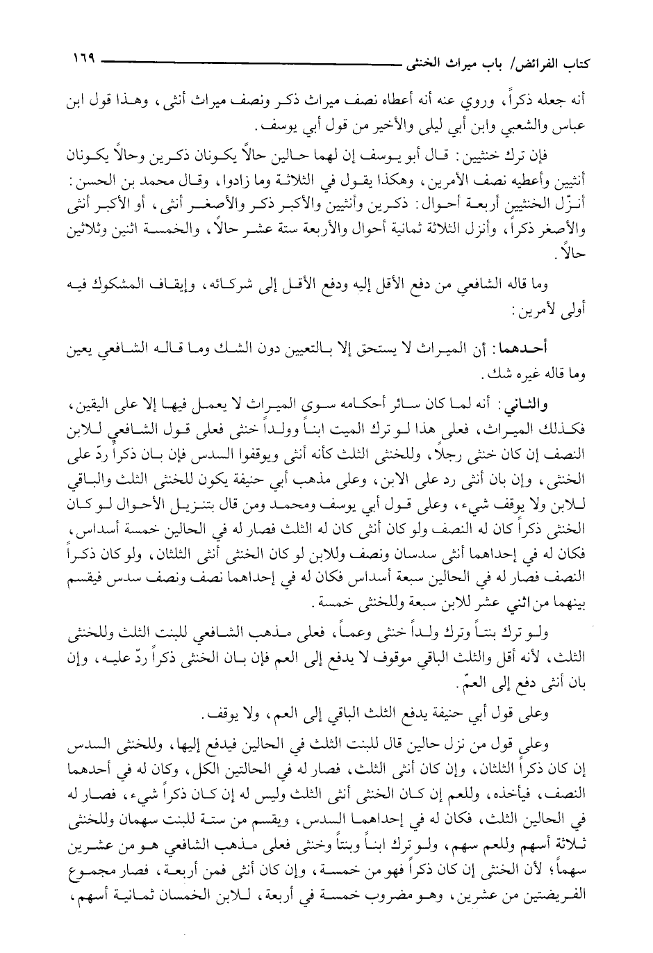 وَالثَّانِي: أَنَّهُ لَمَّا كَانَ سَائِرُ أَحْكَامِهِ سِوَى الْمِيرَاثِ لَا يُعْمَلُ فِيهَا إِلَّا عَلَى الْيَقِينِ، فَكَذَلِكَ الْمِيرَاثُ، فَعَلَى هَذَا لَوْ تَرَكَ الْمَيِّتُ ابْنًا وَوَلَدًا خُنْثَى فعلى قول الشافعي للابن النصف إن كان خنثى رجلا، وللخنثى الثلث كأنه أنثى ويوقفوا السُّدُسَ فَإِنْ بَانَ ذَكَرًا رُدَّ عَلَى الْخُنْثَى، وَإِنْ بَانَ أُنْثَى رُدَّ عَلَى الِابْنِ، وَعَلَى مَذْهَبِ أبي حنيفة يَكُونُ لِلْخُنْثَى الثُّلُثُ وَالْبَاقِي لِلِابْنِ وَلَا يُوقَفُ شَيْءٌ، وَعَلَى قَوْلِ أبي يوسف ومحمد وَمَنْ قَالَ بِتَنْزِيلِ الْأَحْوَالِ لَوْ كَانَ الْخُنْثَى ذَكَرًا كَانَ لَهُ النِّصْفُ وَلَوْ كَانَ أُنْثَى كَانَ لَهُ الثُّلُثُ فَصَارَ لَهُ فِي الْحَالَيْنِ خَمْسَةَ أَسْدَاسٍ، فَكَانَ لَهُ فِي إحداهما أنثى سُدُسَانِ وَنِصْفٌ وَلِلِابْنِ لَوْ كَانَ الْخُنْثَى أُنْثَى الثلثان، ولو كان ذكرا النِّصْفُ فَصَارَ لَهُ فِي الْحَالَيْنِ سَبْعَةَ أَسْدَاسٍ فَكَانَ لَهُ فِي إِحْدَاهُمَا نِصْفٌ وَنِصْفُ سُدُسٍ فَيُقَسَّمُ بَيْنَهُمَا مِنِ اثْنَيْ عَشَرَ لِلِابْنِ سَبْعَةٌ وَلِلْخُنْثَى خَمْسَةٌ.