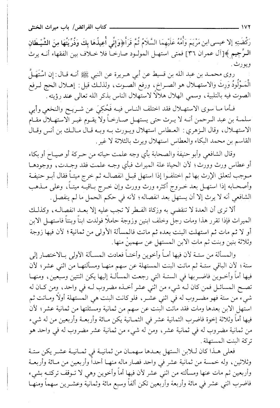 فَعَلَى هَذَا كَانَ لِلِابْنِ الْمُسْتَهِلِّ بَعْدَهَا سَهْمَانِ مِنْ ثمانية في ثمانية عشر يكن سِتَّةً وَثَلَاثِينَ، وَلَهُ خَمْسَةٌ مِنْ ثَمَانِيَةَ عَشَرَ فِي وَاحِدٍ فَصَارَ مَالُهُ مِنْهَا أَحَدًا وَأَرْبَعِينَ مِنْ مِائَةٍ وَأَرْبَعَةٍ وَأَرْبَعِينَ ثُمَّ مَاتَ عَنْهَا وَمَسْأَلَتُهُ مِنِ اثْنَيْ عَشَرَ لِأَنَّ فِيهَا أُمًّا وأخوين وهي لا توقف تَرِكَتَهُ بِشَيْءٍ فَاضْرِبِ اثْنَيْ عَشَرَ فِي مِائَةٍ وأربعة وأربعين تكن ألفا وسبع مائة وثمانية وعشرين سهما ومنها