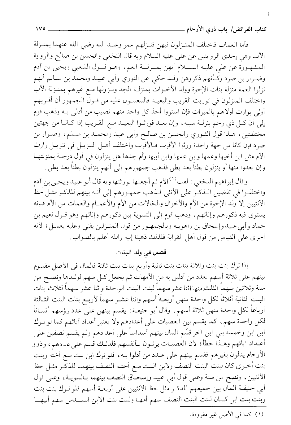 وَقَالَ إِبْرَاهِيمُ النَّخَعِيُّ: الأم ثم أجعلها لِوَرَثَتِهَا وَبِهِ قَالَ أَبُو عُبَيْدٍ وَيَحْيَى بْنُ آدَمَ وَاخْتَلَفُوا فِي تَفْضِيلِ الذَّكَرِ عَلَى الْأُنْثَى فَذَهَبَ جُمْهُورُهُمْ إِلَى أَنَّهُ بَيْنَهُمْ لِلذَّكَرِ مِثْلُ حَظِّ الْأُنْثَيَيْنِ إِلَّا وَلَدَ الْإِخْوَةِ مِنَ الْأُمِّ وَالْأَخْوَالِ وَالْخَالَاتِ مِنَ الْأُمِّ وَالْأَعْمَامِ وَالْعَمَّاتِ مِنَ الأم فإنه يستوي فيه ذكورهم وإناثهم، وَذَهَبَ قَوْمٌ إِلَى التَّسْوِيَةِ بَيْنَ ذُكُورِهِمْ وَإِنَاثِهِمْ وَهُوَ قَوْلُ نُعَيْمِ بْنِ حَمَّادٍ وَأَبِي عُبَيْدٍ وَإِسْحَاقَ بْنِ رَاهَوَيْهِ وَبِالْجُمْهُورِ مِنْ قَوْلِ الْمُنَزِّلِينَ يفتي وعليه يعمل؛ لِأَنَّهُ أَجْرَى عَلَى الْقِيَاسِ مِنْ قَوْلِ أَهْل القرابة فلذلك ذهبنا إليه وَاللَّهُ أَعْلَمُ بِالصَّوَابِ.
