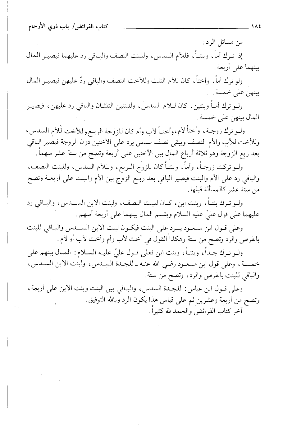 آخَرُ كِتَابِ الْفَرَائِضِ والحمد لله كثيرا.