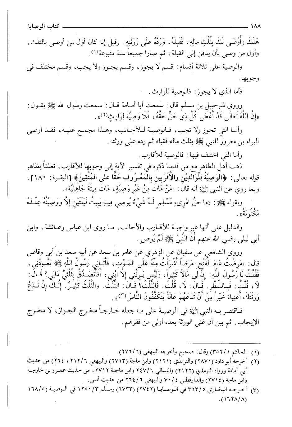 وَرَوَى الشَّافِعِيُّ عَنْ سُفْيَانَ عَنِ الزُّهْرِيِّ عَنِ عَامِرِ بْنِ سَعْدٍ عَنْ أَبِيهِ سَعْدِ بْنِ أَبِي وَقَّاصٍ قَالَ: " مَرِضْتُ عَامَ الْفَتْحِ مَرَضًا أَشْرَفْتُ مِنْهُ عَلَى الْمَوْتِ، فَأَتَانِي رَسُولُ اللَّهِ - صَلَّى اللَّهُ عَلَيْهِ وَسَلَّم َ - يَعُودُنِي، فَقُلْتُ يَا رَسُولَ اللَّهِ: إِنَّ لِي مالا كثيرا، وليس يرثني إلا ابني، أَفَأَتَصَدَّقُ بِثُلُثَيْ مَالِي؟ قَالَ: لَا، قُلْتُ: فَبِالشَّطْرِ. قَالَ: لَا، قُلْتُ: فَالثُّلُثُ؟ قَالَ: الثُّلُثُ. وَالثُّلُثُ كثير. إنك إن تدع ورثتك أغنياء خيرا مِنْ أَنْ تَدَعَهُمْ عَالَةً يَتَكَفَّفُونَ النَّاسَ ".