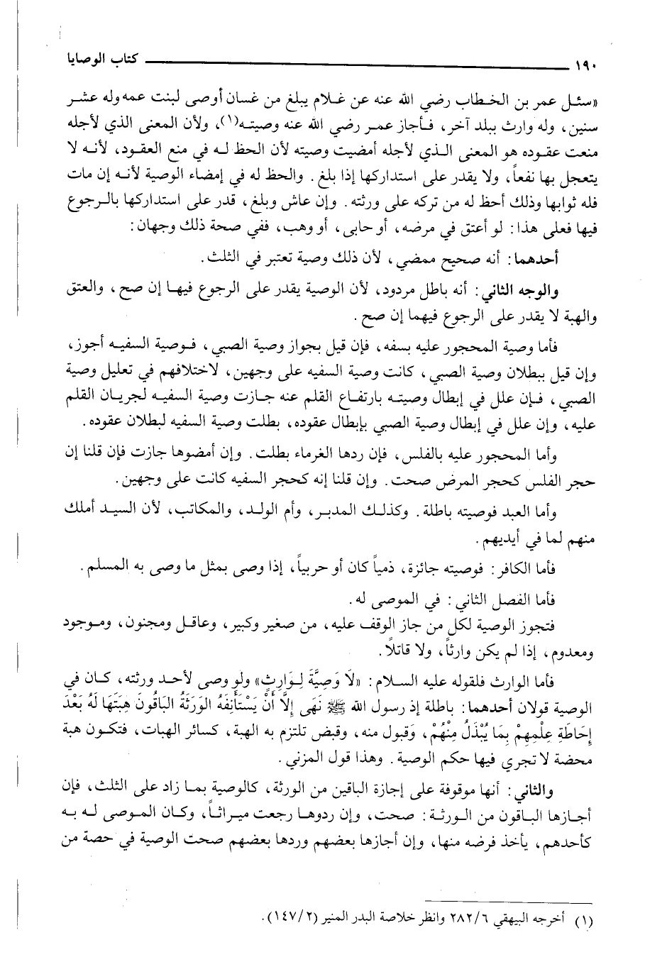 " سُئِلَ عُمَرَ بْنِ الْخَطَّابِ رَضِيَ اللَّهُ عَنْهُ عَنْ غلام يبلغ من غسان أوصى لِبِنْتِ عَمِّهِ وَلَهُ عَشْرُ سِنِينَ، وَلَهُ وَارِثٌ بِبَلَدٍ آخَرَ، فَأَجَازَ عُمَرُ رَضِيَ اللَّهُ عَنْهُ وَصِيَّتَهُ، وَلِأَنَّ الْمَعْنَى الَّذِي لِأَجْلِهِ مُنِعَتْ عُقُودُهُ هو الْمَعْنَى الَّذِي لِأَجْلِهِ أُمْضِيَتْ وَصِيَّتُهُ لِأَنَّ الْحَظَّ لَهُ فِي مَنْعِ الْعُقُودِ، لِأَنَّهُ لَا يَتَعَجَّلُ بها نفعا، ولا يقدر على استدراكها إِذَا بَلَغَ. وَالْحَظُّ لَهُ فِي إِمْضَاءِ الْوَصِيَّةِ لِأَنَّهُ إِنْ مَاتَ فَلَهُ ثَوَابُهَا وَذَلِكَ أَحَظُّ لَهُ مِنْ تَرْكِهِ عَلَى وَرَثَتِهِ. وَإِنْ عَاشَ وبلغ، وقدر على استدراكها بالرجوع فِيهَا فَعَلَى هَذَا: لَوْ أَعْتَقَ فِي مَرَضِهِ، أَوْ حَابَى، أَوْ وَهَبَ، فَفِي صِحَّةِ ذَلِكَ وَجْهَانِ:
