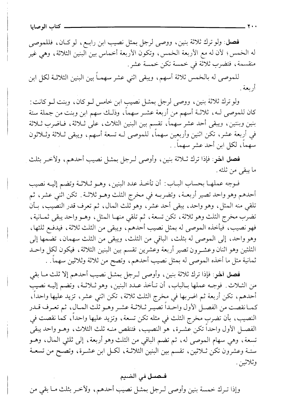 فإذا تَرَكَ ثَلَاثَةَ بَنِينَ، وَأَوْصَى لِرَجُلٍ بِمِثْلِ نَصِيبِ أحدهم إلا ثلث ما بقي من الثلاث. فوجه عملها بالباب، أن تأخذ عدد البنين، وهو ثلاثة، وتضم إِلَيْهِ نَصِيبَ أَحَدِهِمْ، تَكُنْ أَرْبَعَةً ثُمَّ اضْرِبْهَا فِي مَخْرَجِ الثُّلُثِ ثَلَاثَةٍ، تَكُنِ اثْنَيْ عَشَرَ، تزيد عَلَيْهَا وَاحِدًا، كَمَا نَقَصَتْ مِنَ الْفَصْلِ الْأَوَّلِ وَاحِدًا تَصِيرُ ثَلَاثَةَ عَشَرَ وَهُوَ ثُلُثُ الْمَالِ، ثُمَّ تَعْرِفُ قَدْرَ النَّصِيبِ، بِأَنْ تَضْرِبَ مَخْرَجَ الثُّلُثِ فِي مِثْلِهِ تَكُنْ تِسْعَةً، وَتَزِيدُ عَلَيْهَا وَاحِدًا، كَمَا نَقَصَتْ فِي الْفَصْلِ الْأَوَّلِ وَاحِدًا تكن عشرة، هو النصيب، فتنقص منه ثلث الثلاث، وهو واحد يبقى تسعة، وهي سهام الْمُوصَى لَهُ، ثُمَّ تَضُمُّ الْبَاقِي مِنَ الثُّلُثِ وَهُوَ أَرْبَعَةٌ، إِلَى ثُلُثَيِ الْمَالِ، وَهُوَ سِتَّةٌ وعشرون تكن ثلاثين، تقسم بَيْنَ الْبَنِينَ الثَّلَاثَةِ، لِكُلِّ ابْنٍ عَشَرَةٌ، وَتَصِحُّ من تسعة وثلاثين.