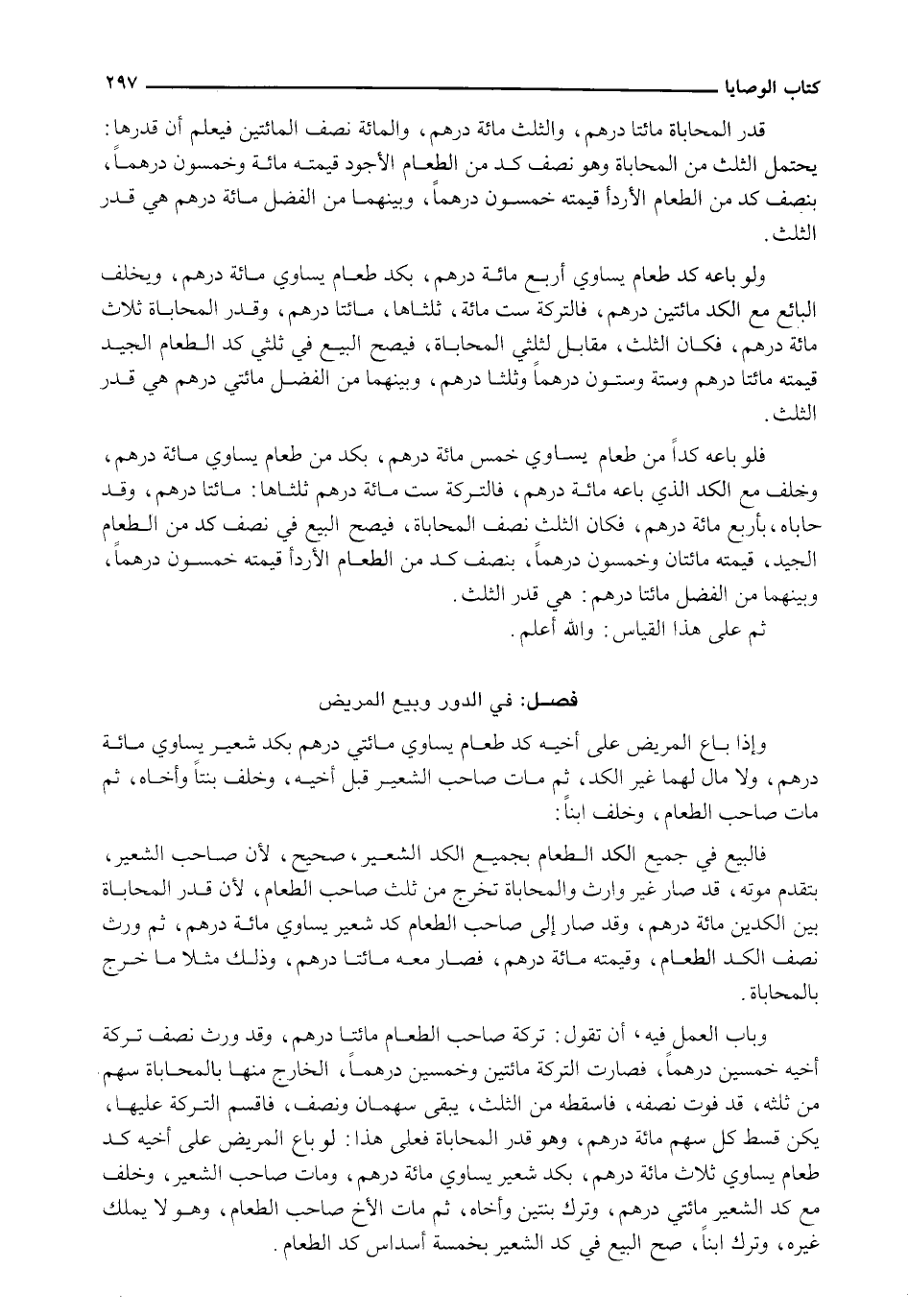 فالبيع في جميع الكد الطعام بجميع الكد الشَّعِيرِ، صَحِيحٌ، لِأَنَّ صَاحِبَ الشَّعِيرِ، بِتَقَدُّمِ مَوْتِهِ، قَدْ صَارَ غَيْرَ وَارِثٍ وَالْمُحَابَاةُ تَخْرُجُ مِنْ ثُلُثِ صَاحِبِ الطَّعَامِ، لِأَنَّ قَدْرَ الْمُحَابَاةِ بَيْنَ الكدين مِائَةُ دِرْهَمٍ، وَقَدْ صَارَ إِلَى صَاحِبِ الطَّعَامِ كد شعير يساوي مائة درهم، ثم ورث نصف الكد الطَّعَامِ، وَقِيمَتُهُ مِائَةُ دِرْهَمٍ، فَصَارَ مَعَهُ مِائَتَا دِرْهَمٍ، وَذَلِكَ مِثْلَا مَا خَرَجَ بِالْمُحَابَاةِ.
