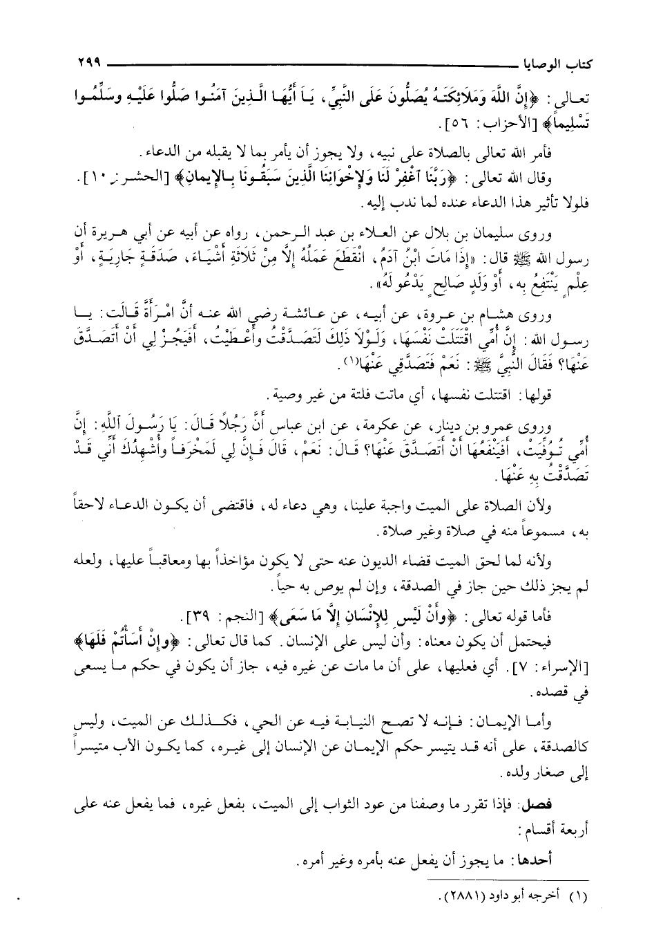فإذا تَقَرَّرَ مَا وَصَفْنَا مِنْ عَوْدِ الثَّوَابِ إِلَى الميت، بفعل غيره، فما يفعل عنه عَلَى أَرْبَعَةِ أَقْسَامٍ:
