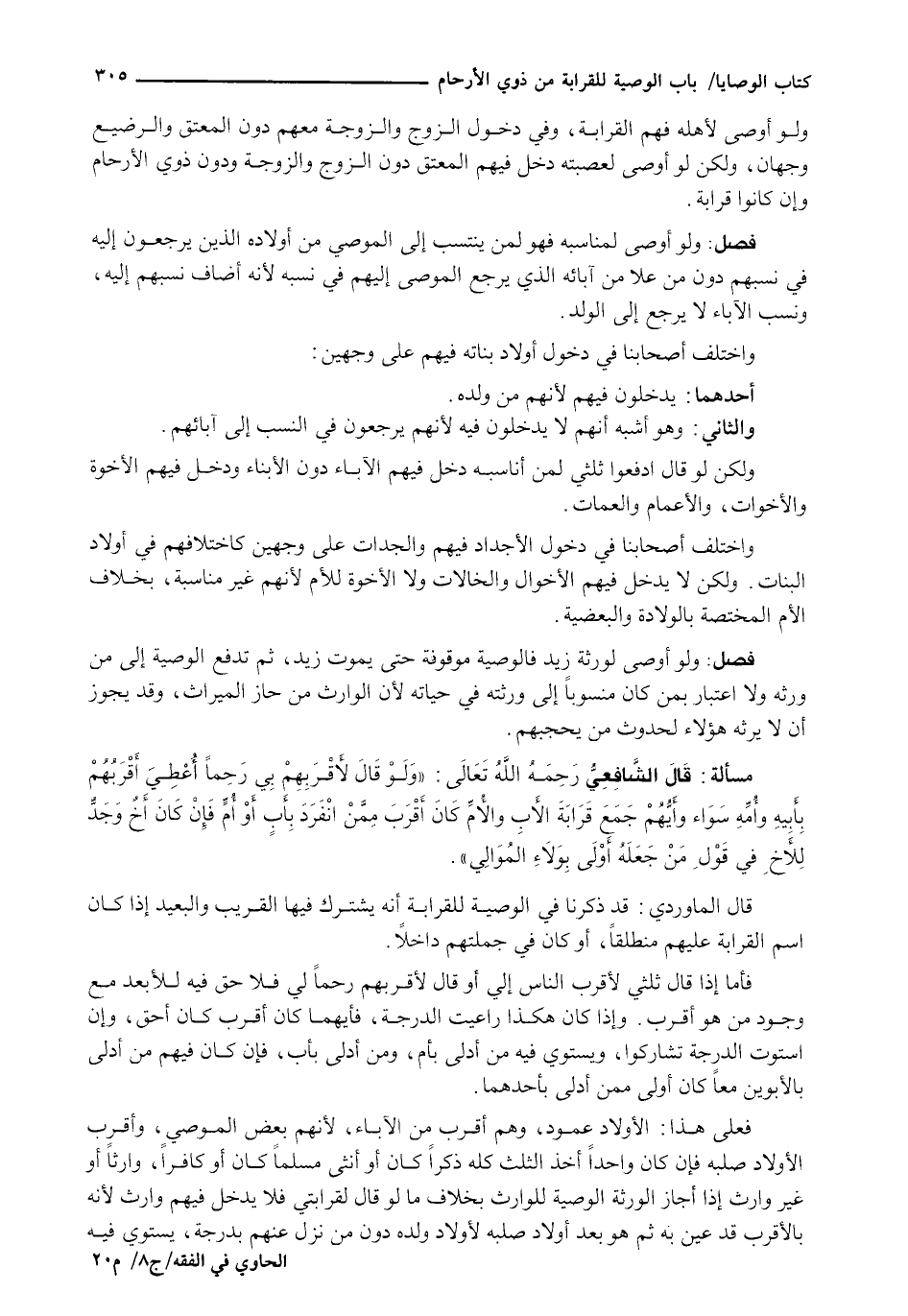 قَالَ الْمَاوَرْدِيُّ: قَدْ ذَكَرْنَا فِي الْوَصِيَّةِ لِلْقَرَابَةِ أَنَّهُ يَشْتَرِكُ فِيهَا الْقَرِيبُ وَالْبَعِيدُ إِذَا كَانَ اسْمُ الْقَرَابَةِ عَلَيْهِمْ مُنْطَلِقًا، أَوْ كَانَ فِي جُمْلَتِهُمْ دَاخِلًا.