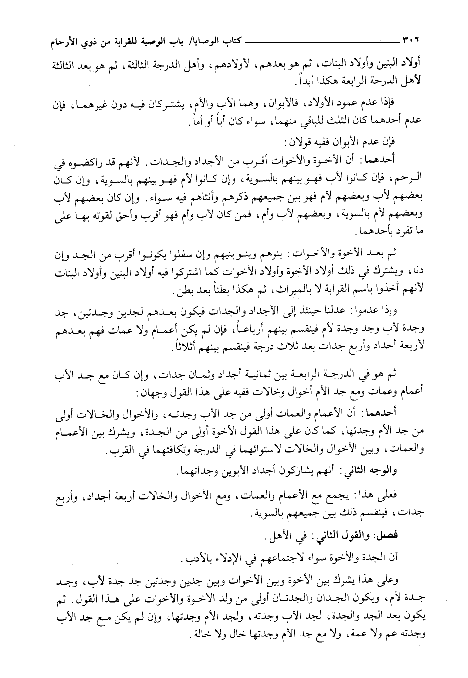 وَعَلَى هَذَا يُشْرَكُ بَيْنَ الْإِخْوَةِ وَبَيْنَ الْأَخَوَاتِ وبين جدين وجدتين جد جدة لأب، وجد جدة لِأُمٍّ، وَيَكُونُ الْجَدَّانِ وَالْجَدَّتَانِ أَوْلَى مِنْ وَلَدِ الْإِخْوَةِ وَالْأَخَوَاتِ عَلَى هَذَا الْقَوْلِ. ثُمَّ يَكُونُ بَعْدَ الْجَدِّ وَالْجَدَّةِ، لِجَدِّ الْأَبِ وَجَدَّتِهِ، وَلِجَدِّ الْأُمِّ وَجَدَّتِهَا، وَإِنْ لَمْ يَكُنْ مَعَ جَدِّ الْأَبِ وَجَدَّتِهِ عَمٌّ وَلَا عَمَّةٌ، وَلَا مَعَ جد الأم وجدتها خال ولا خالة.