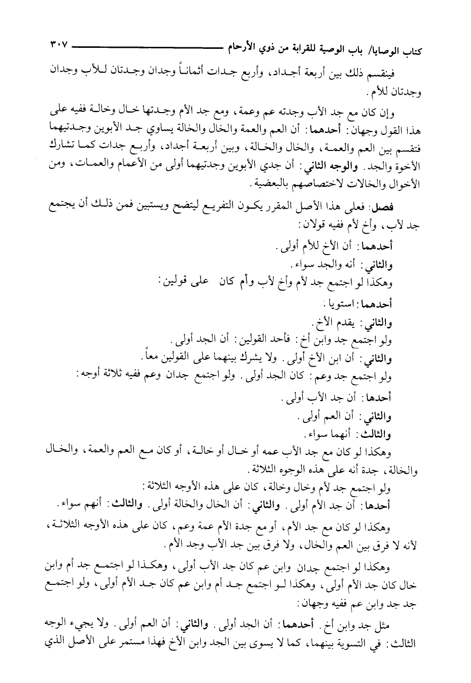 وَإِنْ كَانَ مَعَ جَدِّ الْأَبِ وَجَدَّتِهِ عَمٌّ وَعَمَّةٌ، وَمَعَ جَدِّ الْأُمِّ وَجَدَّتِهَا خَالٌ وَخَالَةٌ فَفِيهِ عَلَى هَذَا الْقَوْلِ وَجْهَانِ: أَحَدُهُمَا: أَنَّ الْعَمَّ وَالْعَمَّةَ والخال ولخالة يساوي جد الأبوين وجدتيهما فتقسم بَيْنَ الْعَمِّ وَالْعَمَّةِ، وَالْخَالِ وَالْخَالَةِ، وَبَيْنَ أَرْبَعَةِ أَجْدَادٍ، وَأَرْبَعِ جَدَّاتٍ كَمَا تُشَارِكُ الْإِخْوَةُ وَالْجَدُّ. وَالْوَجْهُ الثَّانِي: أَنَّ جَدَّيِ الْأَبَوَيْنِ وَجَدَّتَيْهِمَا أَوْلَى مِنَ الْأَعْمَامِ وَالْعَمَّاتِ، وَمِنَ الْأَخْوَالِ وَالْخَالَاتِ لِاخْتِصَاصِهِمْ بِالْبَعْضِيَّةِ.