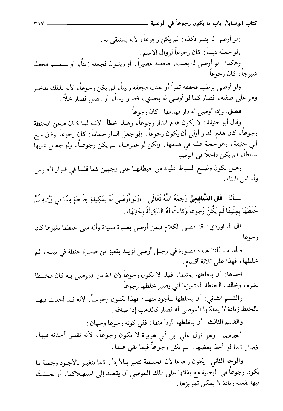 فَأَمَّا مَسْأَلَتُنَا هذه مصورة في رجل أوصى لزيد بقفيز من صبرة حنطة في بيته، ثُمَّ خَلَطَهَا، فَهَذَا عَلَى ثَلَاثَةِ أَقْسَامٍ: