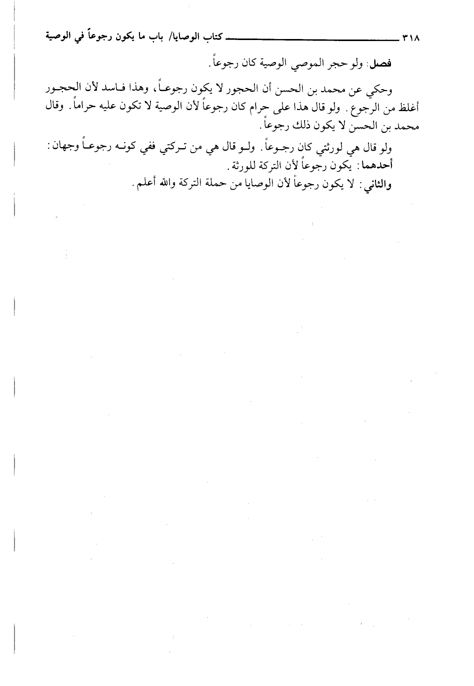 وَحُكِيَ عَنْ محمد بن الحسن أن الحجور لا يكون رجوعا، وهذا فاسد لأن الحجور أغلظ من الرجوع. ولو قال هذا على حَرَامٌ كَانَ رُجُوعًا لِأَنَّ الْوَصِيَّةَ لَا تَكُونُ عَلَيْهِ حَرَامًا. وَقَالَ محمد بن الحسن لَا يكون ذلك رجوعا.