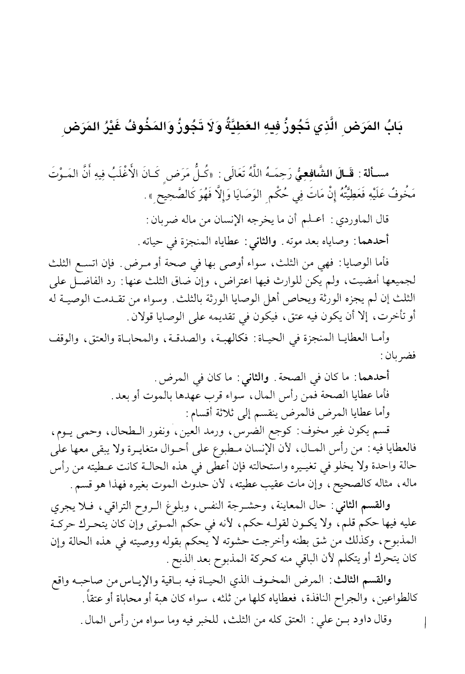 قال الشافعي رحمه الله تعالى: " كُلُّ مَرَضٍ كَانَ الْأَغْلَبُ فِيهِ أَنَّ الْمَوْتَ مَخُوفٌ عَلَيْهِ فَعَطِيَّتُهُ إِنْ مَاتَ فِي حُكْمِ الْوَصَايَا وَإِلَّا فَهُوَ كَالصَّحِيحِ ".