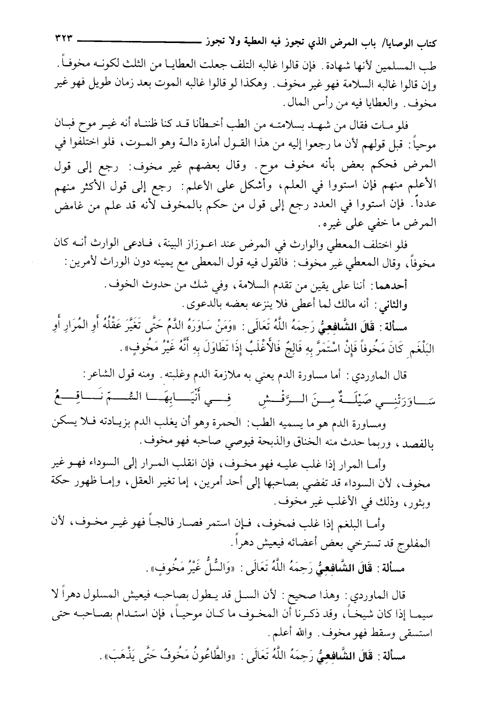 قال الشافعي رحمه الله تعالى: " ومن ساوره الدم حتى تغير عَقْلُهُ أَوِ الْمُرَارِ أَوِ الْبَلْغَم كَانَ مَخُوفًا فإن استمر به فالج فَالْأَغْلَبُ إِذَا تَطَاوَلَ بِهِ أَنَّهُ غَيْرُ مَخُوفٍ ".