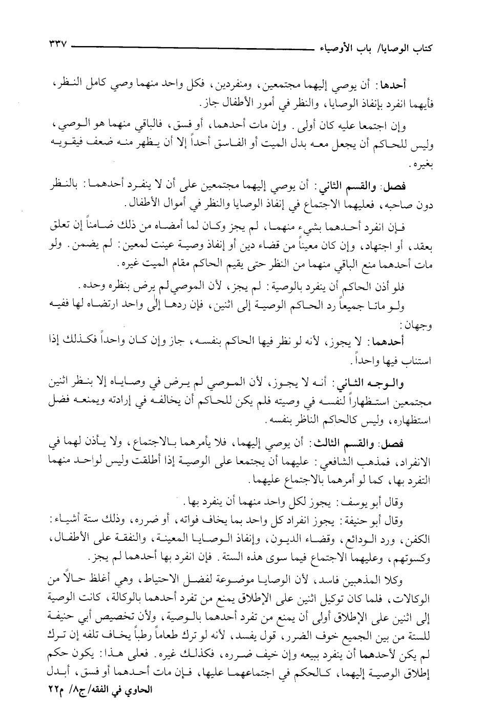 وَكِلَا الْمَذْهَبَيْنِ فَاسِدٌ، لِأَنَّ الْوَصَايَا مَوْضُوعَةٌ لِفَضْلِ الِاحْتِيَاطِ، وَهِيَ أَغْلَظُ حَالًا مِنَ الْوَكَالَاتِ، فَلَمَّا كَانَ تَوْكِيلُ اثْنَيْنِ عَلَى الْإِطْلَاقِ يَمْنَعُ مِنْ تَفَرُّدِ أَحَدِهِمَا بالوكالة، كانت الوصية إلى اثنين إلى الإطلاق أولى أن يمنع مِنْ تَفَرُّدِ أَحَدِهِمَا بِالْوَصِيَّةِ، وَلِأَنَّ تَخْصِيصَ أبي حنيفة للستة من بيع الْجَمِيعِ خَوْفَ الضَّرَرِ، قَوْلٌ يَفْسُدُ، لِأَنَّهُ لَوْ تَرَكَ طَعَامًا رَطْبًا يُخَافُ تَلَفُهُ إِنْ تُرِكَ لَمْ يَكُنْ لِأَحَدِهِمَا أَنْ يَنْفَرِدَ بِبَيْعِهِ وَإِنْ خِيفَ ضَرَرُهُ، فَكَذَلِكَ غَيْرُهُ. فَعَلَى هَذَا: يَكُونُ حُكْمُ إِطْلَاقِ الْوَصِيَّةِ إِلَيْهِمَا، كَالْحُكْمِ فِي اجْتِمَاعِهِمَا عَلَيْهَا، فَإِنْ مَاتَ أَحَدُهُمَا، أَوْ فَسَقَ، أَبْدَلَ