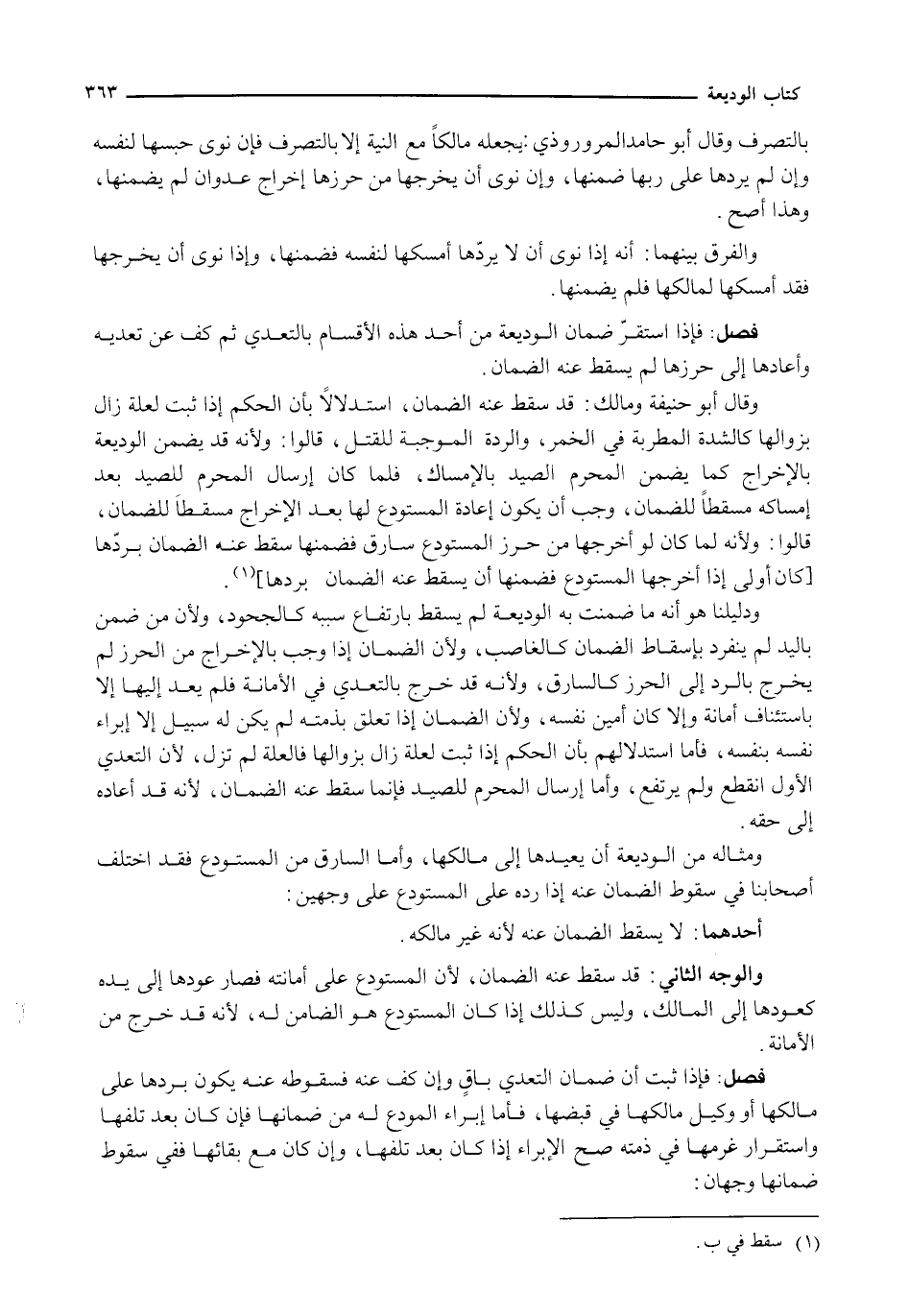 وَقَالَ أبو حنيفة وَمَالِكٌ: قَدْ سَقَطَ عَنْهُ الضَّمَانُ، اسْتِدْلَالًا بِأَنَّ الْحُكْمَ إِذَا ثَبَتَ لِعِلَّةٍ زَالَ بِزَوَالِهَا كَالشِّدَّةِ المطربة في الخمر، والردة الموجبة للقتل، قَالُوا: وَلِأَنَّهُ قَدْ يَضْمَنُ الْوَدِيعَةَ بِالْإِخْرَاجِ كَمَا يضمن المحرم الصَّيْدَ بِالْإِمْسَاكِ، فَلَمَّا كَانَ إِرْسَالُ الْمُحْرِمِ لِلصَّيْدِ بَعْدَ إِمْسَاكِهِ مُسْقِطًا لِلضَّمَانِ، وَجَبَ أَنْ يَكُونَ إِعَادَةُ الْمُسْتَوْدَعِ لَهَا بَعْدَ الْإِخْرَاجِ مُسْقِطًا لِلضَّمَانِ، قَالُوا: وَلِأَنَّهُ لَمَّا كَانَ لَوْ أَخْرَجَهَا مِنْ حرز المستودع سارق فضمنها سقط عنه الضمان بردها [كان أولى إذا أخرجها المستودع فضمنها أَنْ يَسْقُطَ عَنْهُ الضَّمَانُ بِرَدِّهَا] .