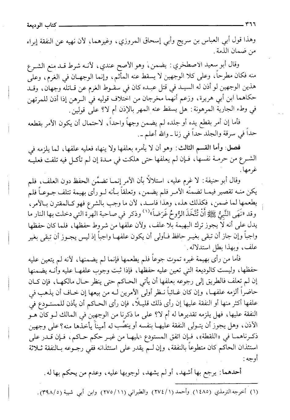 وَقَالَ أبو حنيفة: لَا غُرْمَ عَلَيْهِ، اسْتِدْلَالًا بِأَنَّ الْأَمْرَ إِنَّمَا تَضَمَّنَ الْحِفْظَ دُونَ الْعَلْفِ، فَلَمْ يَكُنْ مِنْهُ تَقْصِيرٌ فِيمَا تَضَمَّنَهُ الْأَمْرُ فَلَمْ يَضْمَنْ، وَتَعَلُّقًا بِأَنَّهُ لَوْ رَأَى بَهِيمَةً تَتْلَفُ جُوعًا فَلَمْ يُطْعِمْهَا لَمَا ضَمِنَ، فَكَذَلِكَ هَذِهِ، وَهَذَا فَاسِدٌ، لَأَنَّ مَا وجب بالشرع فَهُوَ كَالْمُقْتَرِنِ بِالْأَمْرِ، وَقَدْ نَهَى النَّبِيُّ - صَلَّى اللَّهُ عَلَيْهِ وَسَلَّم َ - " أَنْ تُتَّخَذَ الرُوحُ غَرَضًا " وَذَكَرَ فِي صَاحِبَةِ الْهِرَّةِ الَّتِي دَخَلَتْ بِهَا النَّارُ مَا يَدُلُّ عَلَى أَنَّهُ لَا يَجُوزُ تَرْكُ الْبَهِيمَةِ بِلَا عَلْفٍ، وَلِأَنَّ عَلْفَهَا مِنْ شُرُوطِ حِفْظِهَا، فَلَمَّا كَانَ حِفْظُهَا وَاجِبًا وَإِنْ جَازَ أَنْ تَبْقَى بغير حافظ أولى أَنْ يَكُونَ عَلْفُهَا وَاجِبًا إِذْ لَيْسَ يَجُوزُ أَنْ تَبْقَى بِغَيْرِ عَلْفٍ، وَبِهَذَا بَطَلَ اسْتِدْلَالُهُ.