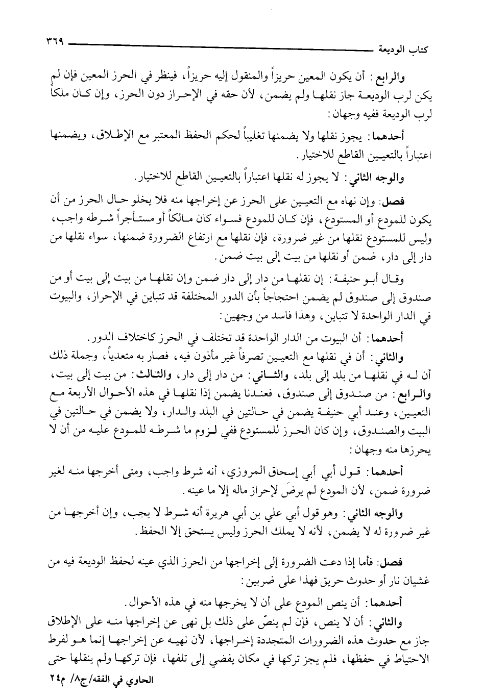 وَالثَّانِي: أَنَّ فِي نَقْلِهَا مَعَ التَّعْيِينِ تَصَرُّفًا غَيْرَ مَأْذُونٍ فِيهِ، فَصَارَ بِهِ مُتَعَدِّيًا، وجملة ذلك أن له في نقلها مِنْ بَلَدٍ إِلَى بَلَدٍ، وَالثَّانِي: مِنْ دَارٍ إِلَى دَارٍ، وَالثَّالِثُ: مِنْ بَيْتٍ إِلَى بَيْتٍ، وَالرَّابِعُ: مِنْ صُنْدُوقٍ إِلَى صُنْدُوقٍ، فَعِنْدَنَا يَضْمَنُ إِذَا نَقَلَهَا فِي هَذِهِ الْأَحْوَالِ الْأَرْبَعَةِ مَعَ التَّعْيِينِ، وَعِنْدَ أبي حنيفة يَضْمَنُ فِي حَالَتَيْنِ فِي الْبَلَدِ وَالدَّارِ، وَلَا يَضْمَنُ فِي حَالَتَيْنِ فِي الْبَيْتِ وَالصُّنْدُوقِ، وَإِنْ كَانَ الْحِرْزُ لِلْمُسْتَوْدَعِ فَفِي لُزُومِ مَا شَرَطَهُ لِلْمُودِعِ عَلَيْهِ مِنْ أن لا يحرزها منه وجهان: