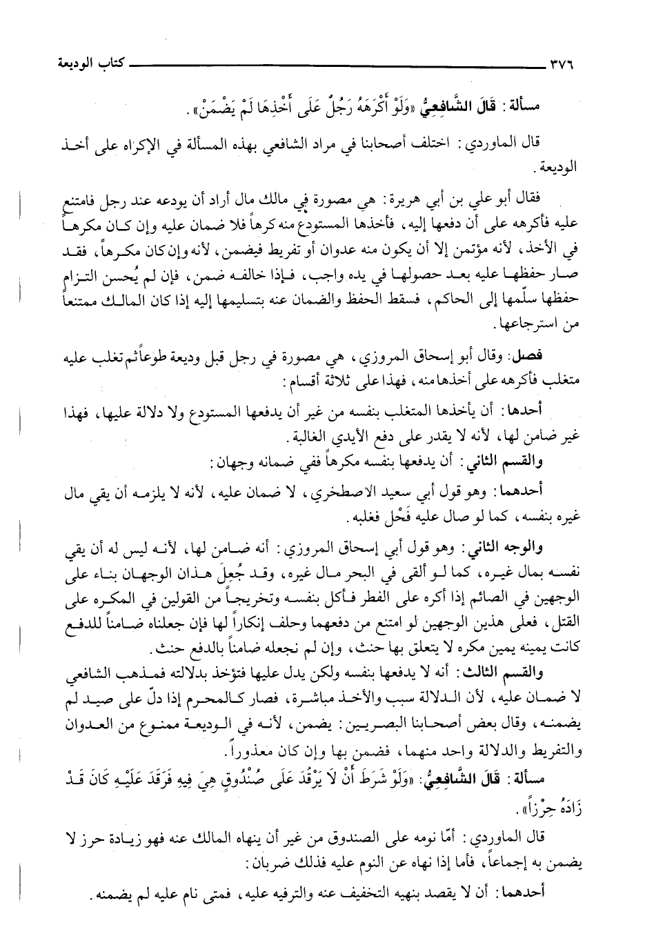 قَالَ الْمَاوَرْدِيُّ: اخْتَلَفَ أَصْحَابُنَا فِي مُرَادِ الشَّافِعِيِّ بِهَذِهِ الْمَسْأَلَةِ فِي الْإِكْرَاهِ عَلَى أَخْذِ الْوَدِيعَةِ.