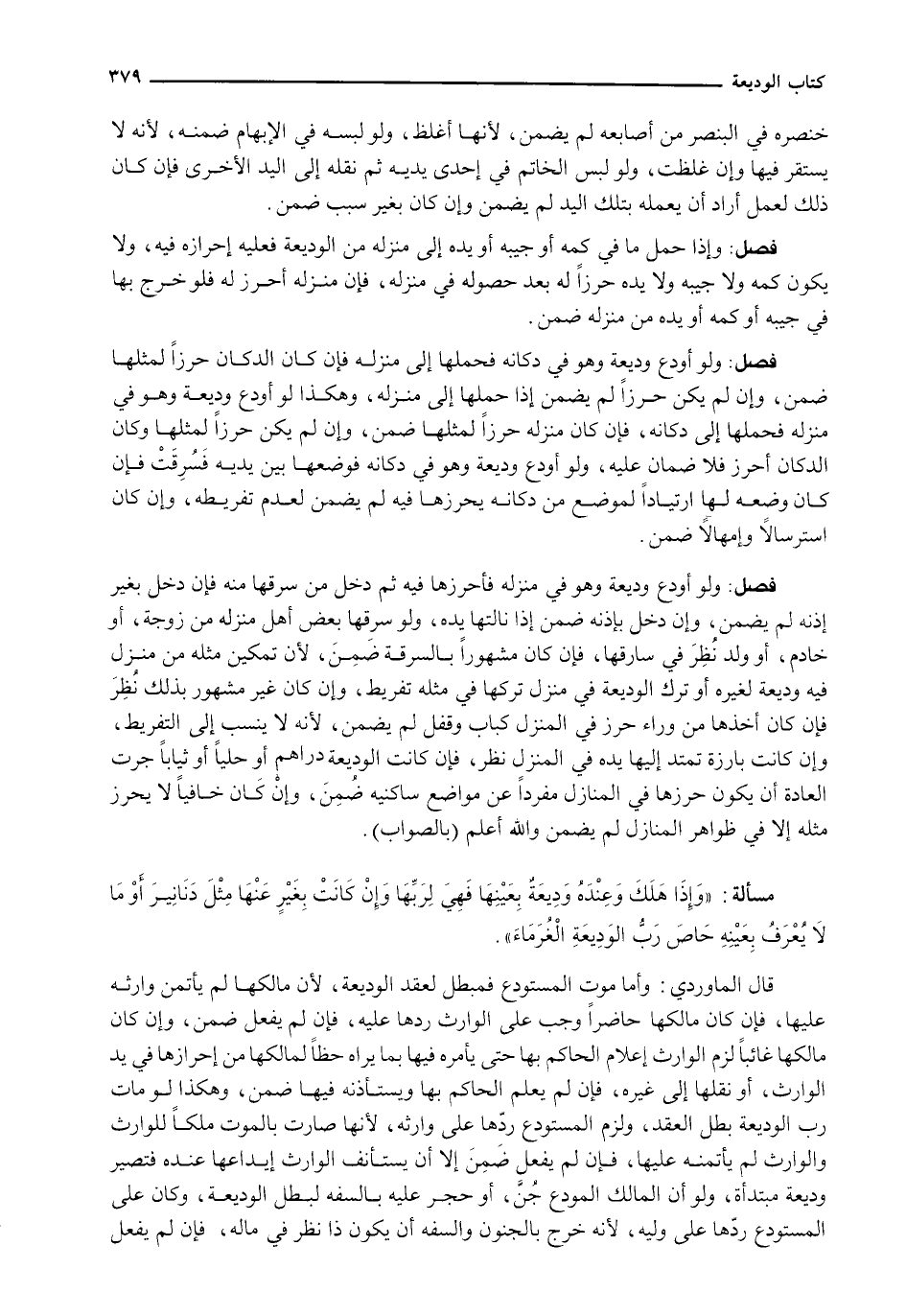قَالَ الْمَاوَرْدِيُّ: وَأَمَّا مَوْتُ الْمُسْتَوْدَعِ فَمُبْطِلٌ لِعَقْدِ الْوَدِيعَةِ، لِأَنَّ مَالِكَهَا لَمْ يَأْتَمِنْ وَارِثَهُ عَلَيْهَا، فَإِنْ كَانَ مَالِكُهَا حَاضِرًا وَجَبَ عَلَى الْوَارِثِ رَدُّهَا عَلَيْهِ، فَإِنْ لَمْ يَفْعَلْ ضَمِنَ، وَإِنْ كَانَ مَالِكُهَا غَائِبًا لَزِمَ الْوَارِثَ إِعْلَامُ الحاكم بها حتى يأمره فيها بِمَا يَرَاهُ حَظًّا لِمَالِكِهَا مِنْ إِحْرَازِهَا فِي يَدِ الْوَارِثِ، أَوْ نَقْلِهَا إِلَى غَيْرِهِ، فَإِنْ لَمْ يَعْلَمِ الْحَاكِمُ بِهَا وَيَسْتَأْذِنْهُ فِيهَا ضَمِنَ، وَهَكَذَا لَوْ مَاتَ رَبُّ الْوَدِيعَةِ بَطَلَ الْعَقْدُ، وَلَزِمَ الْمُسْتَوْدَعَ رَدُّهَا عَلَى وَارِثِهِ، لِأَنَّهَا صَارَتْ بِالْمَوْتِ مِلْكًا لِلْوَارِثِ وَالْوَارِثُ لَمْ يَأْتَمِنْهُ عَلَيْهَا، فَإِنْ لَمْ يَفْعَلْ ضَمِنَ إِلَّا أَنْ يَسْتَأْنِفَ الْوَارِثُ إِيدَاعَهَا عِنْدَهُ فَتَصِيرُ وَدِيعَةً مُبْتَدَأَةً، وَلَوْ أَنَّ الْمَالِكَ الْمُودِعَ جُنَّ، أَوْ حُجِرَ عَلَيْهِ بالسفه لبطل الْوَدِيعَةُ، وَكَانَ عَلَى الْمُسْتَوْدَعِ رَدُّهَا عَلَى وَلِيِّهِ، لِأَنَّهُ خَرَجَ بِالْجُنُونِ وَالسَّفَهِ أَنْ يَكُونَ ذَا نَظَرٍ فِي مَالِهِ، فَإِنْ لَمْ يَفْعَلِ
