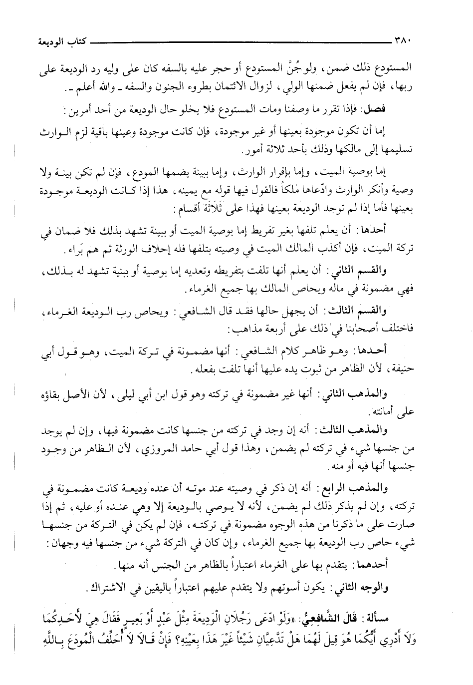 وَالْمَذْهَبُ الرَّابِعُ: أَنَّهُ إِنْ ذَكَرَ فِي وَصِيَّتِهِ عِنْدَ مَوْتِهِ أَنَّ عِنْدَهُ وَدِيعَةً كَانَتْ مَضْمُونَةً فِي تَرِكَتِهِ، وَإِنْ لَمْ يَذْكُرْ ذَلِكَ لَمْ يَضْمَنْ، لِأَنَّهُ لَا يُوصِي بِالْوَدِيعَةِ إِلَّا وَهِيَ عِنْدَهُ أَوْ عَلَيْهِ، ثُمَّ إِذَا صَارَتْ عَلَى مَا ذَكَرْنَا مِنْ هَذِهِ الْوُجُوهِ مَضْمُونَةً فِي تَرِكَتِهِ، فَإِنْ لَمْ يَكُنْ فِي التَّرِكَةِ مِنْ جِنْسِهَا شَيْءٌ حَاصَّ رَبُّ الْوَدِيعَةِ بِهَا جَمِيعَ الْغُرَمَاءِ، وَإِنْ كَانَ فِي التَّرِكَةِ شيء من جنسها فيه وَجْهَانِ: