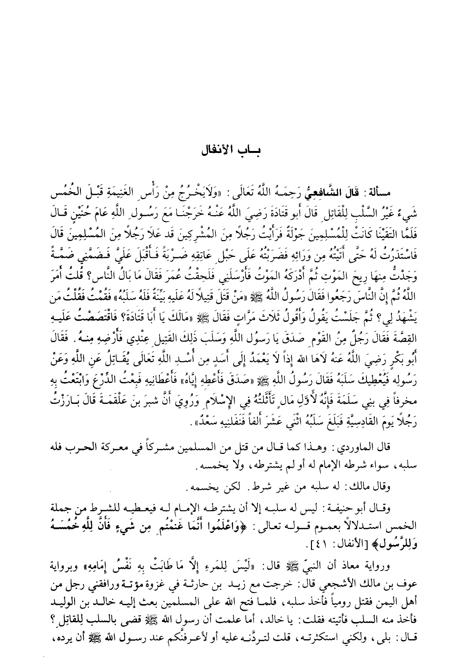 قال الشافعي رحمه الله تعالى: " وَلَا يَخْرُجُ مِنْ رَأْسِ الْغَنِيمَةِ قَبْلَ الْخُمُسِ شيء غير السلب للقاتل قال أبو قتادة رضي الله عنه خرجنا مع رسول الله عام حنين قال فلما التقينا كانت للمسلمين جولة فَرَأَيْتُ رَجُلًا مِنَ الْمُشْرِكِينَ قَدْ عَلَا رَجُلًا من المسلمين قال فاستدرت له حتى أتيته من ورائه فَضَرَبْتُهُ عَلَى حَبْلِ عَاتِقِهِ ضَرْبَةً فَأَقْبَلَ عَلَيَّ فَضَمَّنِي ضَمَّةً وَجَدْتُ مِنْهَا رِيحَ الْمَوْتِ ثُمَّ أدركه الموت فأرسلني فلحقت عمر فقال ما بال الناس؟ قلت أَمْرُ اللَّهِ ثُمَّ إِنَّ النَّاسَ رَجَعُوا فَقَالَ رَسُولُ اللَّهِ - صَلَّى اللَّهُ عَلَيْهِ وَسَلَّم َ -: " مَنْ قَتَلَ قَتِيلًا لَهُ عَلَيْهِ بَيِّنَةٌ فَلَهُ سلبه " فقمت فقلت من يشهد لي؟ ثم جلست يقول وأقول ثلاث مرات فقال - صَلَّى اللَّهُ عَلَيْهِ وَسَلَّم َ -: " مَا لَكَ يَا أَبَا قَتَادَةَ؟ فَاقْتَصَصْتُ عَلَيْهِ الْقِصَّةَ فَقَالَ رَجُلٌ مِنَ الْقَوْمِ صَدَقَ يَا رَسُولَ اللَّهِ وَسَلَبُ ذَلِكَ الْقَتِيلِ عِنْدِي فَأَرْضِهْ منه. فقال أبو بكر رضي الله عنه لاها الله إذا لَا يَعْمِدُ إِلَى أَسَدٍ مِنْ أُسْدِ اللَّهِ تعالى يُقَاتِلُ عَنِ اللَّهِ وَعَنْ رَسُولِهِ فَيُعْطِيكَ سَلَبَهُ فَقَالَ رَسُولُ اللَّهِ - صَلَّى اللَّهُ عَلَيْهِ وَسَلَّم َ -: " صدق فأعطه إياه " فأعطانيه فبعت الدرع وابتعت بِهِ مَخْرَفًا فِي بَنِي سَلَمَةَ فَإِنَّهُ لَأَوَّلُ مال تأثلته في الإسلام وروي أن شبر بن علقمة قال بارزت رَجُلًا يَوْمَ الْقَادِسِيَّةِ فَبَلَغَ سَلَبُهُ اثْنَيْ عَشَرَ ألفا فنفلنيه سعد ".